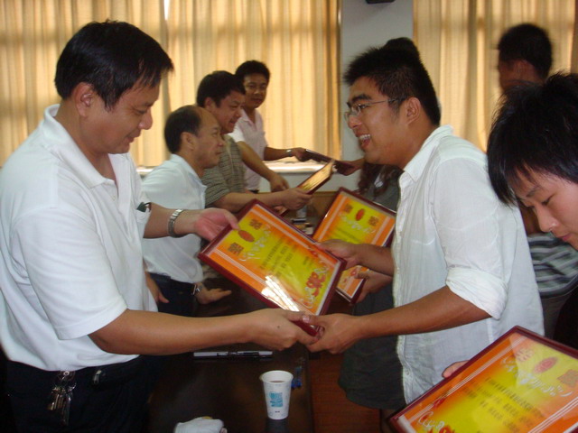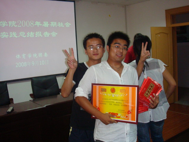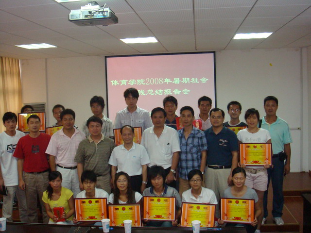 会上,来自学院各年级的共10支重点团队或小分队以PPT的形式对此次暑期社会实践工作进行了总结汇报,他们的汇报图文并茂,紧抓各个实践活动的主题,并用最具表现主题的图片配合精彩的团队成员感想,突出社会实践过程的艰辛与成果收获的喜悦。本次汇报分别评出重点团队一、二、三等奖和院级小分队一、二、三等奖。2007级体育教育一班以赴天长“青春建功新农村”重点团队获重点团队组优秀组织一等奖,2006级体育教育专业赴芜湖、皖北“宣扬奥运、践行荣辱观”小分队获小分队组优秀组织一等奖。院党委书记贡植斌老师对同学们的活动汇报给予了点评,对本次暑期社会实践给予了充分的肯定,对同学们在活动中的表现给予了高度评价,并希望同学们在今后的暑期实践活动中再接再厉,争取更大成绩。随后,院领导亲自为获奖团队和个人颁奖并和获奖同学代表合影留念。