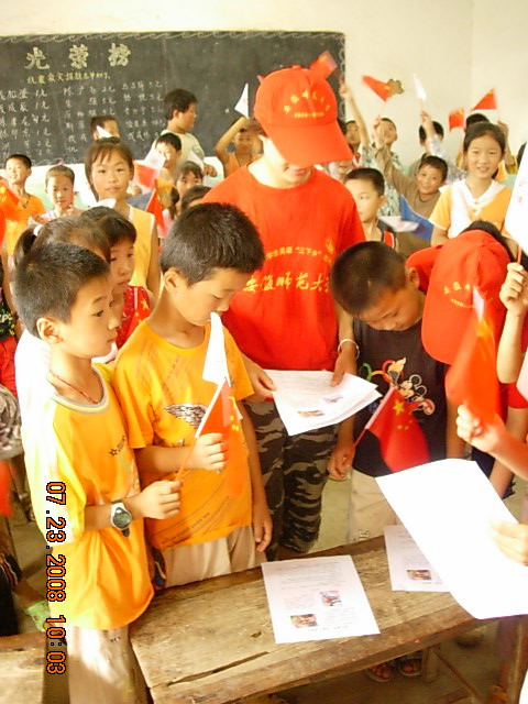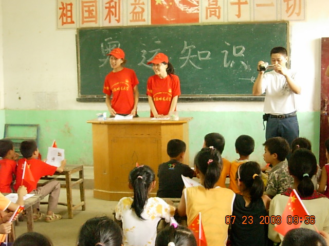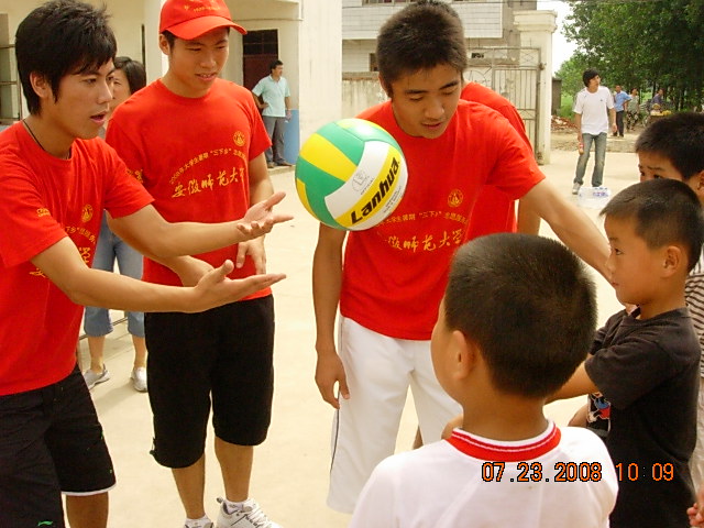 第一节课是志愿团的队员们为小同学们讲解和宣传奥运知识,让他们更多的了解奥运;接着是解决小学生们学习方面问题,由我们的志愿小老师一一解答所同学们提出的各个学习上的难题;而身为437ccm必赢国际版的志愿者来说教孩子们体育运动是我们最拿手的也是必不可少的,篮球、排球、跳绳和拔河比赛各项运动也在石庙小学的操场上展开了。整个气氛看起来十分和谐融洽,每个人的脸上都洋溢着甜美的笑容。