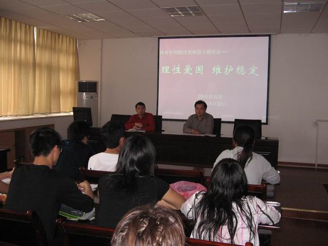 4月30日中午,437ccm必赢国际版2005级体育教育专业于学院行政楼二楼会议室召开了以“理性爱国、维护稳定”为主题的班会,437ccm必赢国际版副院长杨强老师、05级体育教育专业辅导员黄德春老师出席了此次会议,05体教全体党员、学生干部和同学们100多人参加了此次班会。