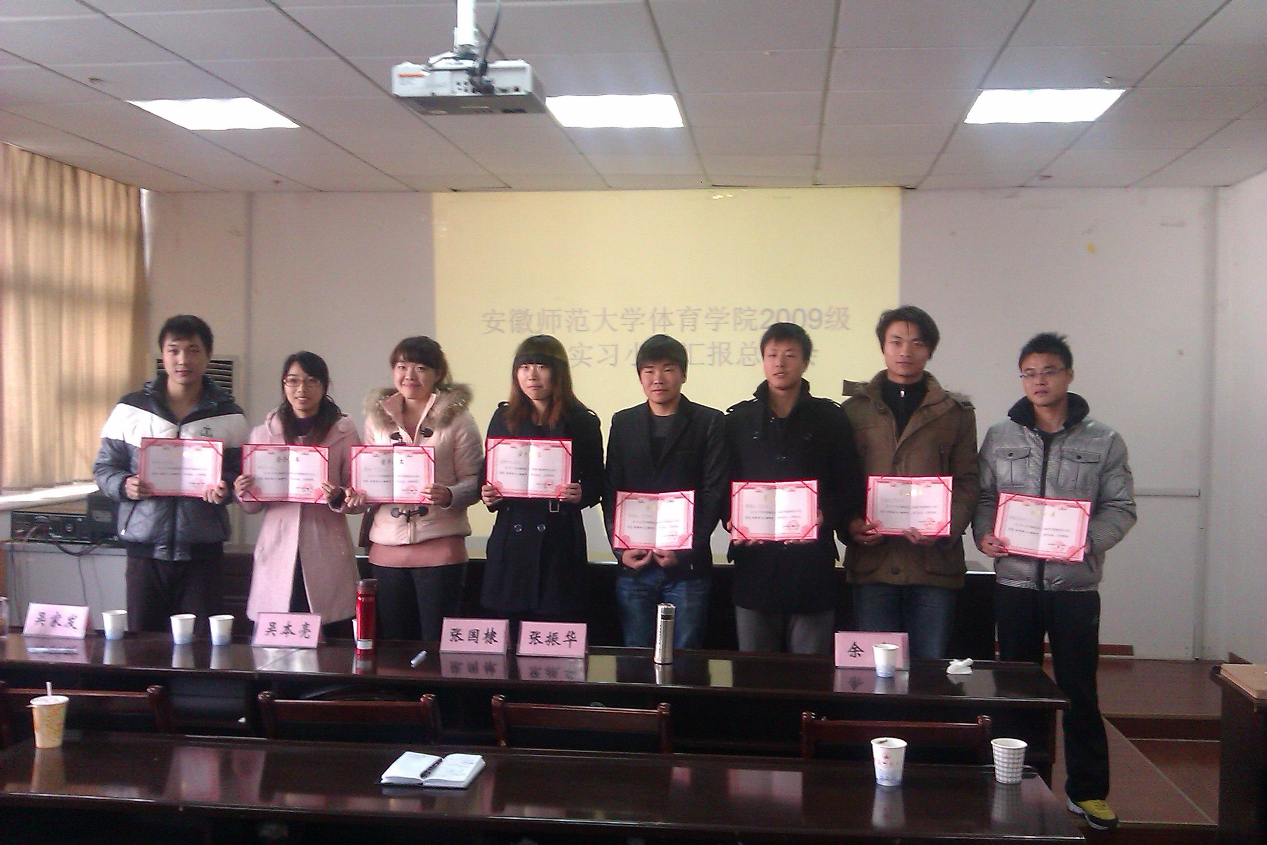 此次表彰会分为两个阶段。上午8:00举行2009级教育实习优秀实习小组评选活动。26个实习小组分别从课前准备、课堂教学、第二课堂、教学效果、听看课、评课等六个方面做了精彩的汇报。最后,评委根据每个实习小组的汇报情况评选出师大附中、芜湖一中、芜湖县二中、皖南医学院、芜湖市八中、省中医药高专、芜湖三中、芜湖三十四中等八个实习小组为院优秀实习小组,其中师大附中、芜湖一中实习小组分列第一名和第二名,评委们分别给八个优秀实习小组颁发了奖状。