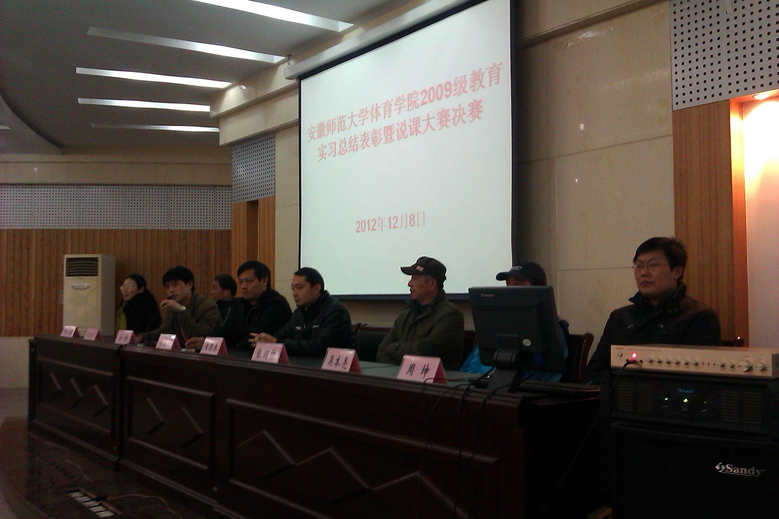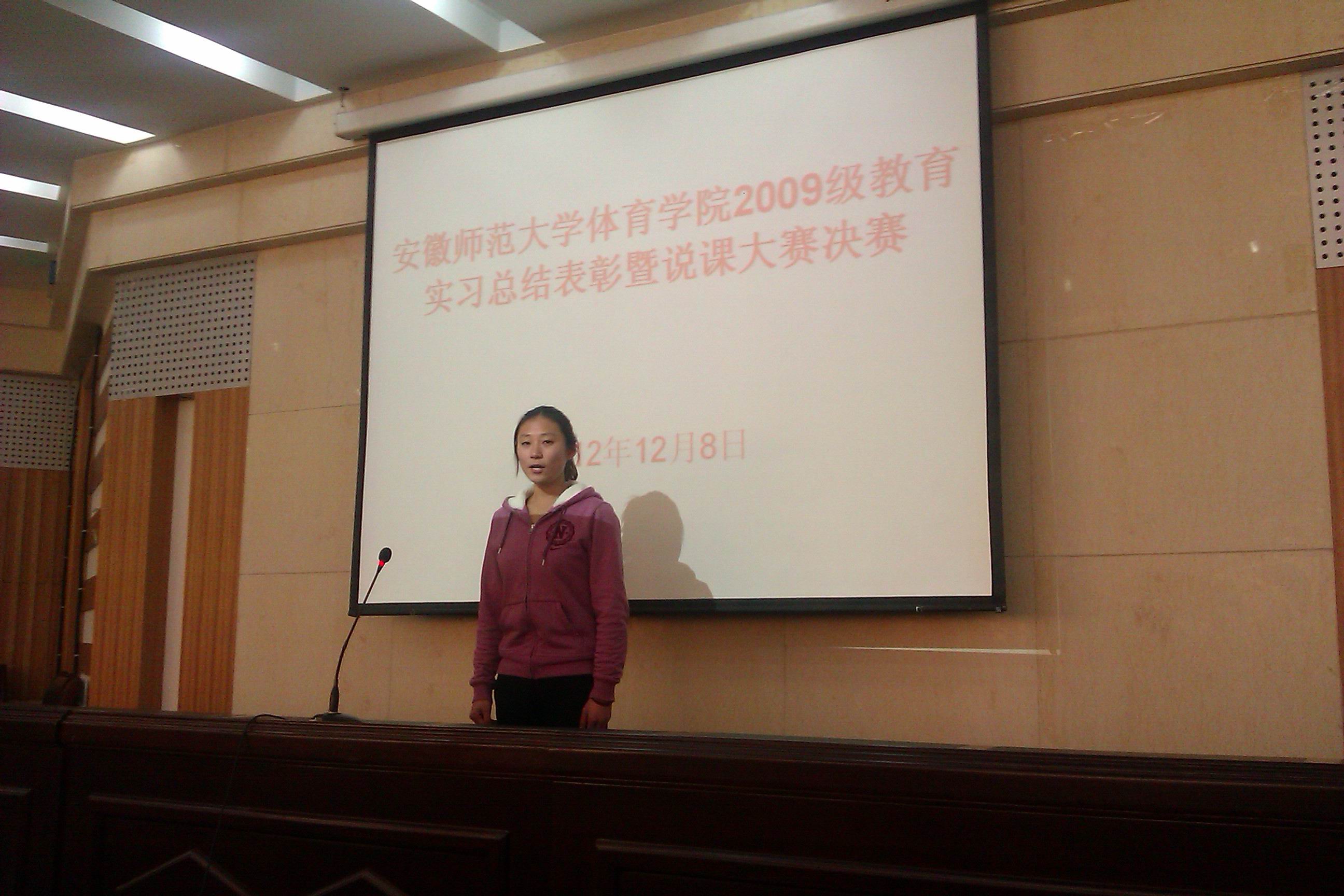 下午2:30,为了进一步加强实践教学,检验实习效果,在报告厅又举行了本科生说课大赛决赛。八名进入决赛的选手经过精心准备,以无生上课的形式展示了自己的体育专业技能、体育教学能力和表达能力,最后俞春晓同学获一等奖、李颖、余凯等6为同学分别获得二、三等奖和优秀奖。有关领导和老师为获奖者颁发了奖状和奖品。最后,金涛副院长对实习工作做了总结,并对同学们提出了要求,他指出:(一)希望同学们认真总结,全面吸收固化实习的成果;(二)希望同学们转换角色,全身心的回到学习中来;(三)希望同学们常怀一颗感恩之心,以更优异的成绩回报父母、老师、学校和社会。