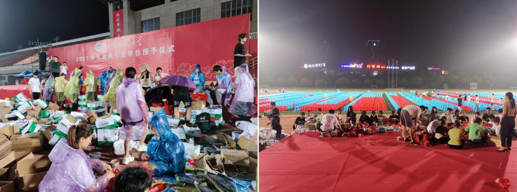为充分保障学校毕业典礼顺利进行,437ccm必赢国际版分党校入党积极分子培训班全体学员在北田径场参加了“学党史办实事-我为毕业典礼做服务”的志愿服务活动。近万只凳子的搬运、摆放,上万份礼品袋的拆解、装封,堆积如山的垃圾的清扫、搬运,面对海量的工作任务,培训班全体学员在崔世兵、陈实、朱克习等领导老师带领下,发扬不怕苦不怕累精神,唱着红歌、喊着号子,经过6个多小时一刻不停的奋战,至18日凌晨,终于将毕业典礼现场布置完毕。