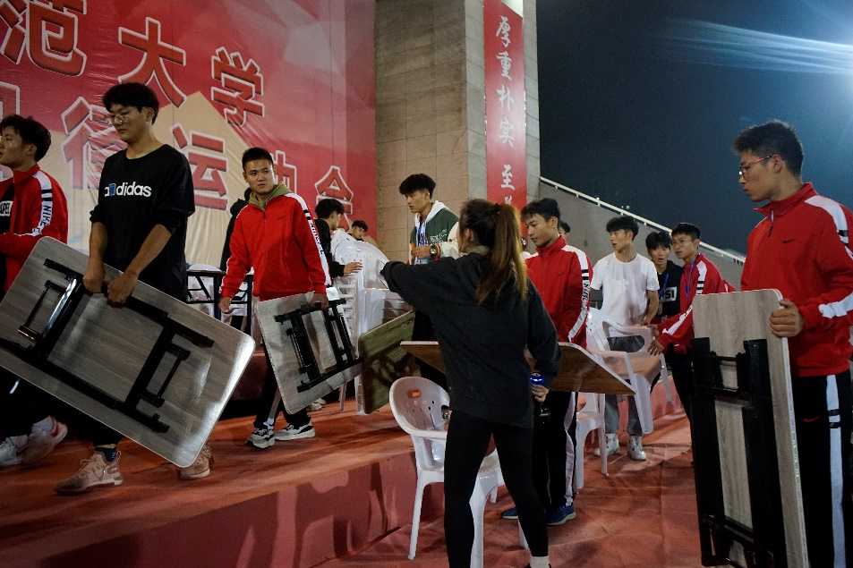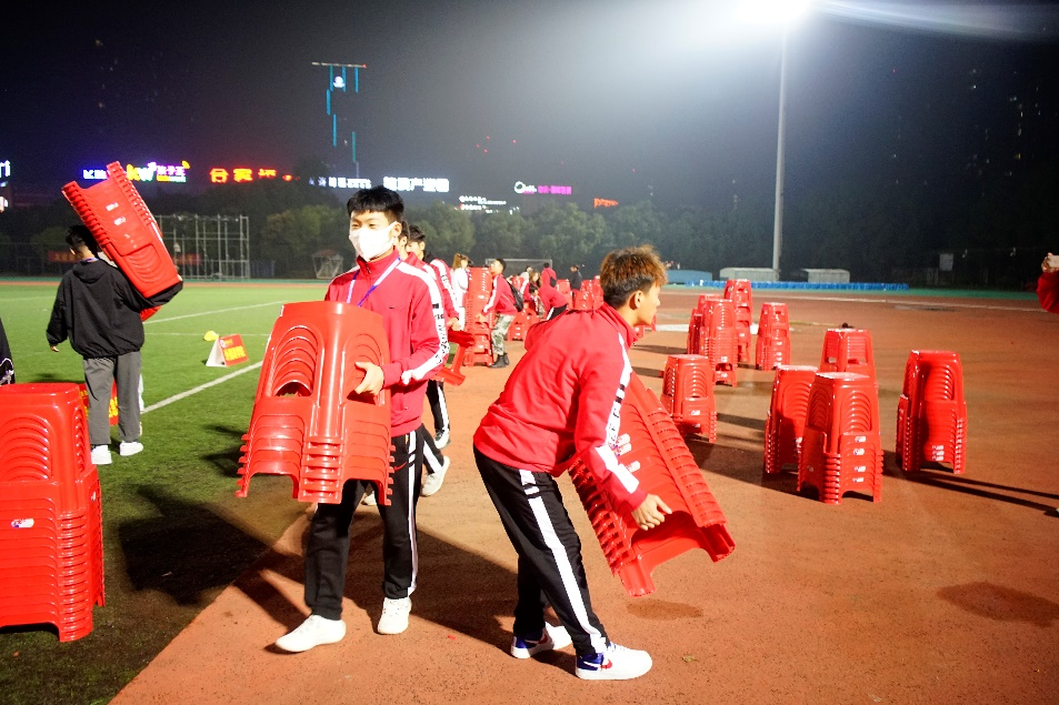 体院200多名志愿者全程参加了开幕式的志愿服务工作,他们需要提前将体育场内的大型体育设施整体搬运至场边,将数千只运动员退场后观看文体展演时的坐凳提前搬运到指定场所,需要保障实施常态化疫情防控措施下的万余名师生有序进出场,还要以秒来精确计算、组织参加开幕式暨文体展演表演的数千名师生在不同时段精准进退场。他们顾不上吃饭更顾不上休息,充分发挥437ccm必赢国际版青年文明号志愿服务队不怕吃苦能打硬仗的优良作风。在秋夜里7℃的低温环境下,朴实的红色单薄衣衫,忙碌飞奔的身影,灯光下飞舞得细小汗水,一幕成花,一幕成画。