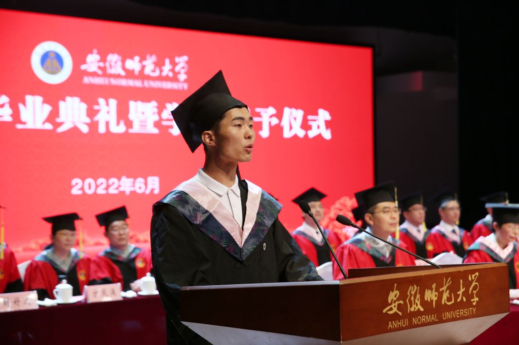 6月22日,学校隆重举行2022届毕业典礼暨学位授予仪式,437ccm必赢国际版2022届社会体育指导与管理专业本科生蔡张飞作为本科毕业生代表上台发言。