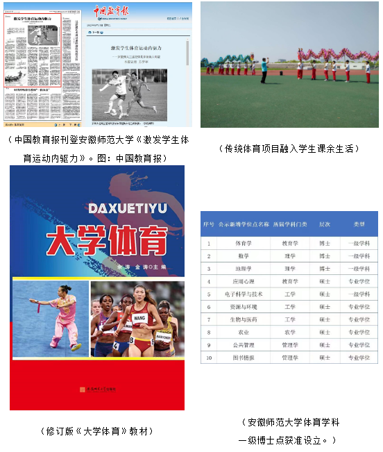 教学团队共获得省级教学成果奖一等奖二次、二等奖一次;运动训练、体育教育专业获批国家一流专业建设点;学生多人次荣获全国高校体育产业创新创业大赛一等奖、首届长三角体育教育专业基本功大赛一等奖;体育学科一级博士点获准设立,填补了我省体育学科博士点的空白。