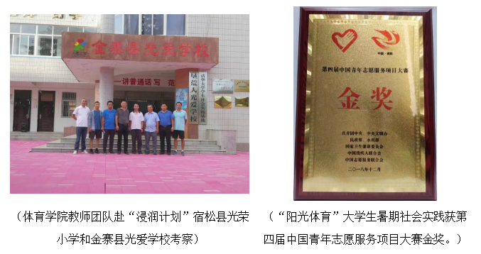 学校承担教育部体育美育“浸润计划”,为金寨、宿松教育扶贫与乡村振兴事业贡献力量。参与录制的2019年全国教科文卫体系统《职工啦啦操》系列节目获全国推广。每年开展“阳光体育”大学生暑期社会实践活动,荣获第四届中国青年志愿服务项目大赛金奖,累计建设服务基地22个,招募大学生志愿者8000余人,服务人群14.89万人,服务时长累计超36000小时。