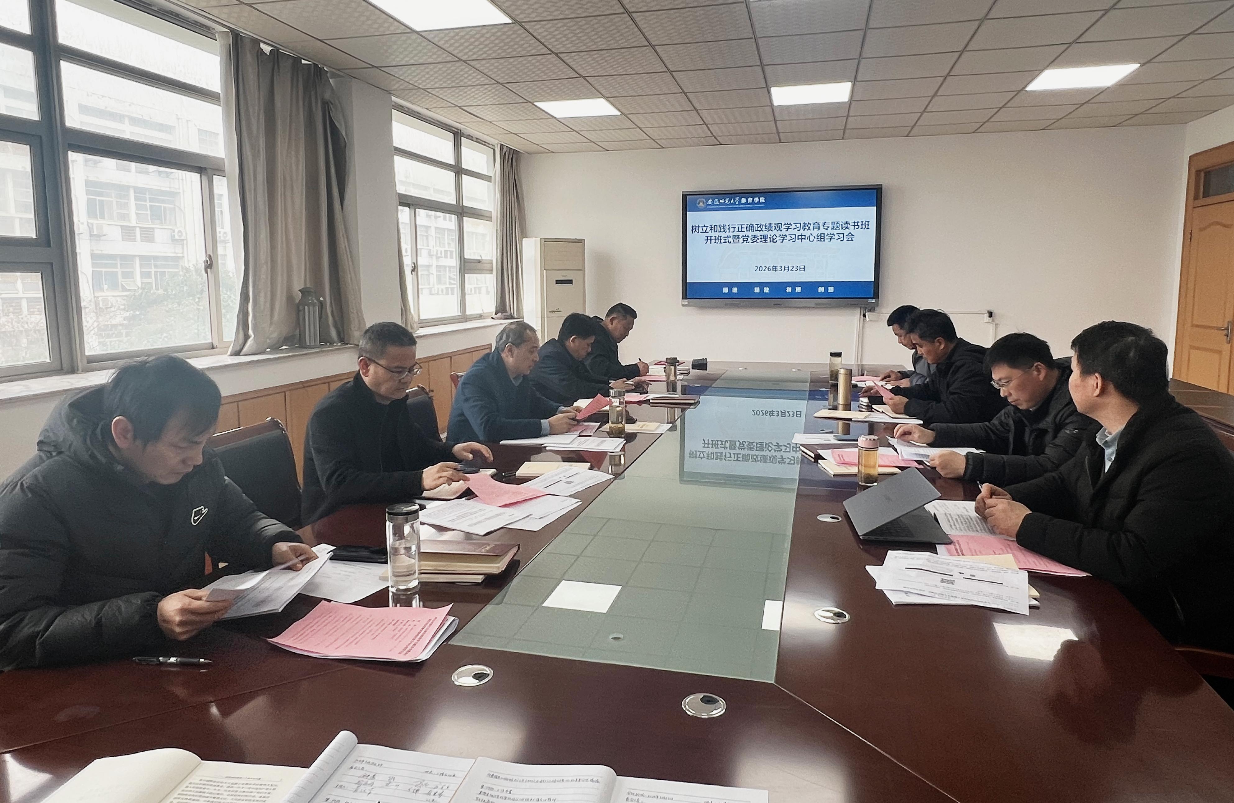 3月23日下午,437ccm必赢国际版在院三楼会议室召开树立和践行正确政绩观学习教育专题读书班开班式暨党委理论学习中心组学习会。院领导班子成员、党委委员参加会议。会议由学院党委书记黄德春主持。