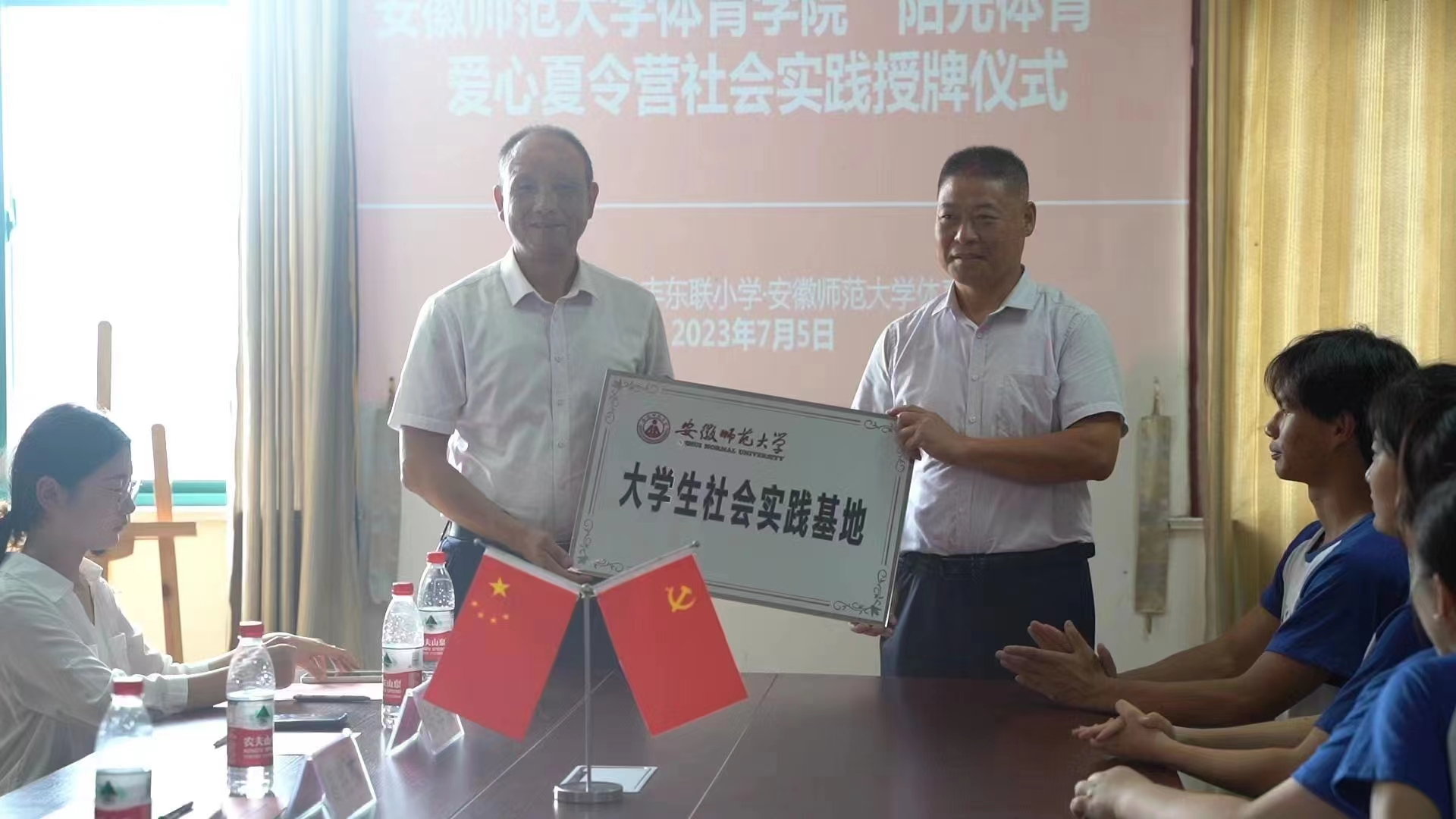随后,举行了大学生社会实践基地授牌仪式,崔世兵代表学校向铜陵市义安区永丰东联小学授牌,朱光华代表铜陵市义安区永丰东联小学接牌。