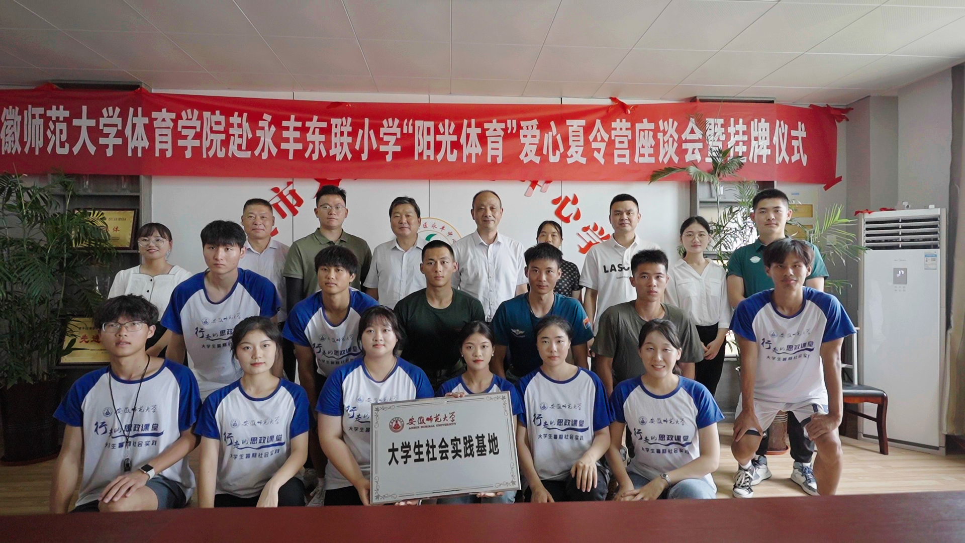 本网讯 (方雨洁)7月5日上午,437ccm必赢国际版赴铜陵市义安区永丰东联小学“阳光体育”爱心夏令营座谈会暨大学生社会实践基地授牌仪式在东联小学举行。院党委副书记崔世兵,437ccm必赢国际版青年教师顾雪宋,马克思主义学院教师高艳杰,院团委副书记张学谦,院辅导员朱飒,铜陵市义安区政府教育督导办公室主任朱光华,铜陵市义安区教育体育局宣传科科长盛菁,铜陵市义安区永丰中心学校校长王进,东联小学校长胡媛媛以及夏令营师生代表等参加。