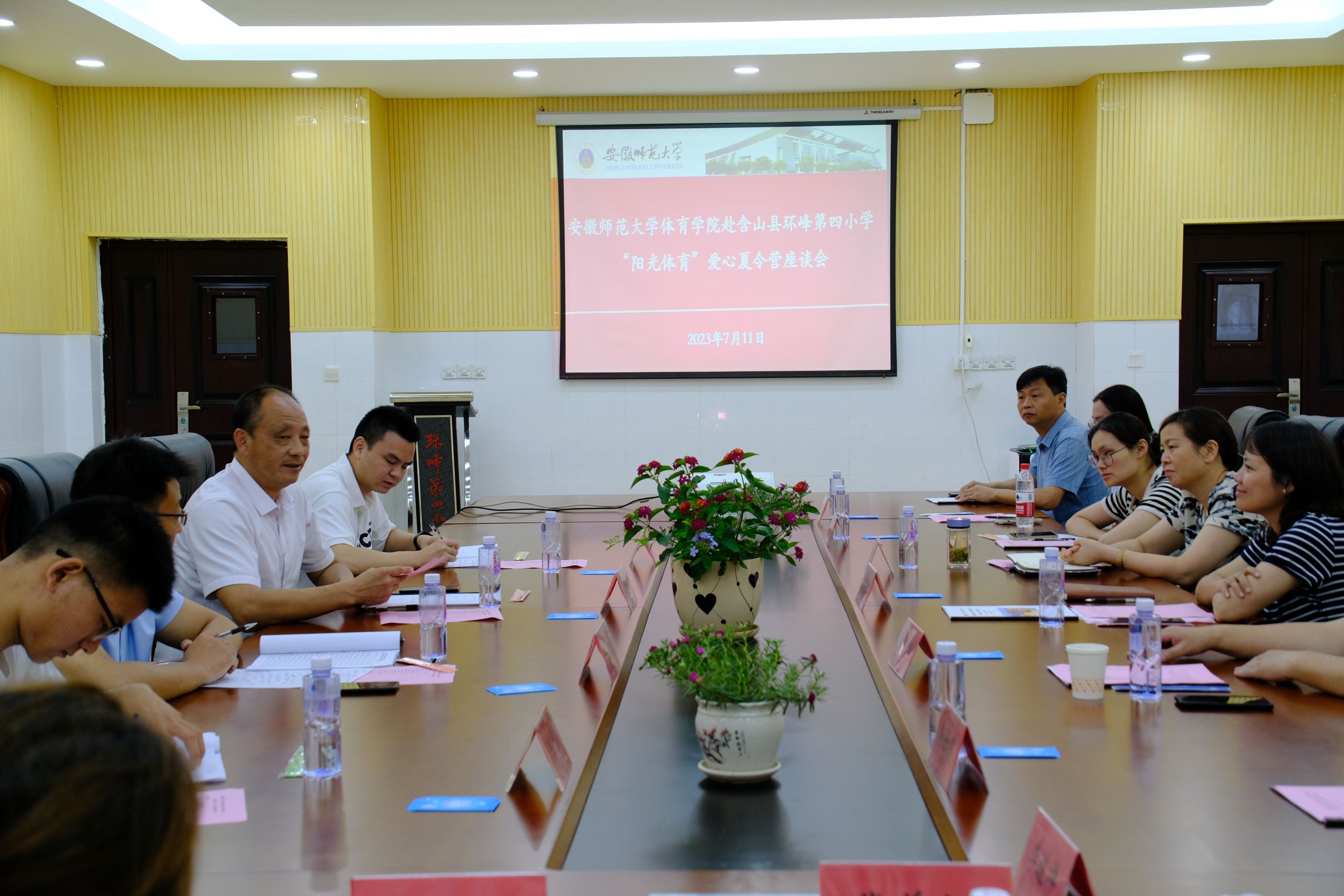 本网讯 (代诗静 黄申怡)7月11日上午,437ccm必赢国际版领导赴马鞍山环峰第四小学“阳光体育”爱心夏令营慰问活动暨座谈会在环峰第四小学举行。437ccm必赢国际版党委副书记崔世兵、院社会实践团队指导教师孙正、院团委副书记张学谦、辅导员陈雷,含山县人民政府副县长汪媛霞、县关工委常务副主任洪少华、县教育局局长黄维秀、县妇联一级科员孙如霞、团县委学少部部长江皖宁、环峰第四小学校长裴善好、环峰第四小学党支部副书记季道祥、环峰第四小学副校长尹方林、环峰第四小学副校长朱小庆及夏令营团队成员参加。