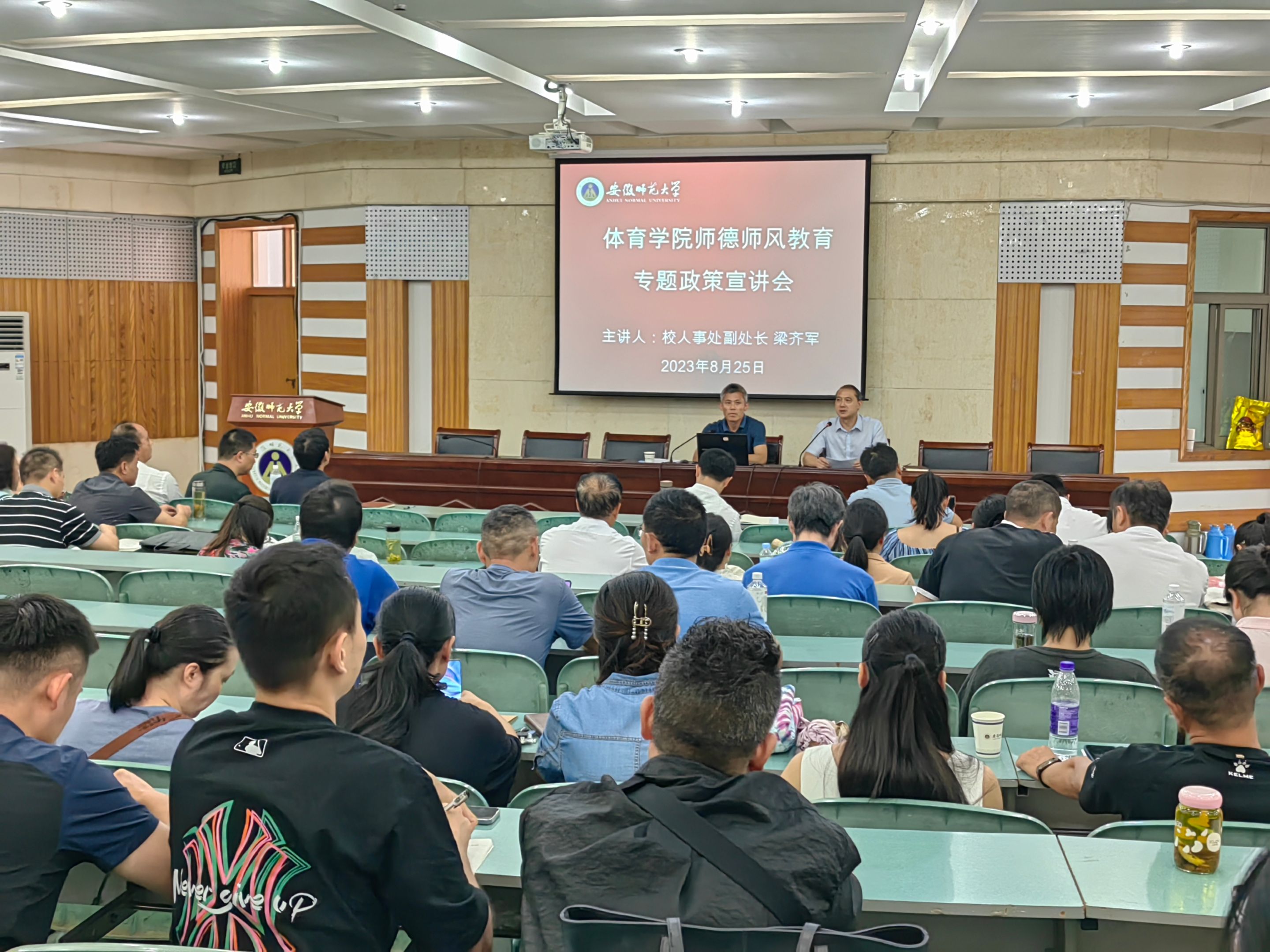 8月25日,437ccm必赢国际版举行师德师风教育专题政策宣讲会,校人事处副处长梁齐军应邀作专题报告,学院全体教职工参加学习教育,会议由学院党委书记黄德春主持。