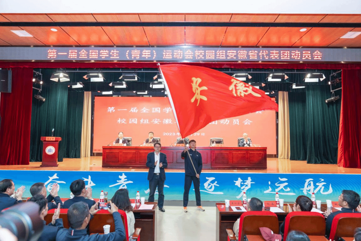 本网讯 10月29日,第一届全国学生(青年)运动会即将开幕之际,安徽省教育厅在安徽体育运动职业学院报告厅隆重召开第一届学青会校园组安徽省代表团动员大会。bwin必赢线路检测437ccm必赢国际版院长金涛、副院长高升、余涛、岳建军和各代表队教练员、运动员参加本次动员大会。我院教师金迪作为安徽省教练员代表发言,我院学子刘宗权担任安徽省代表团旗手。