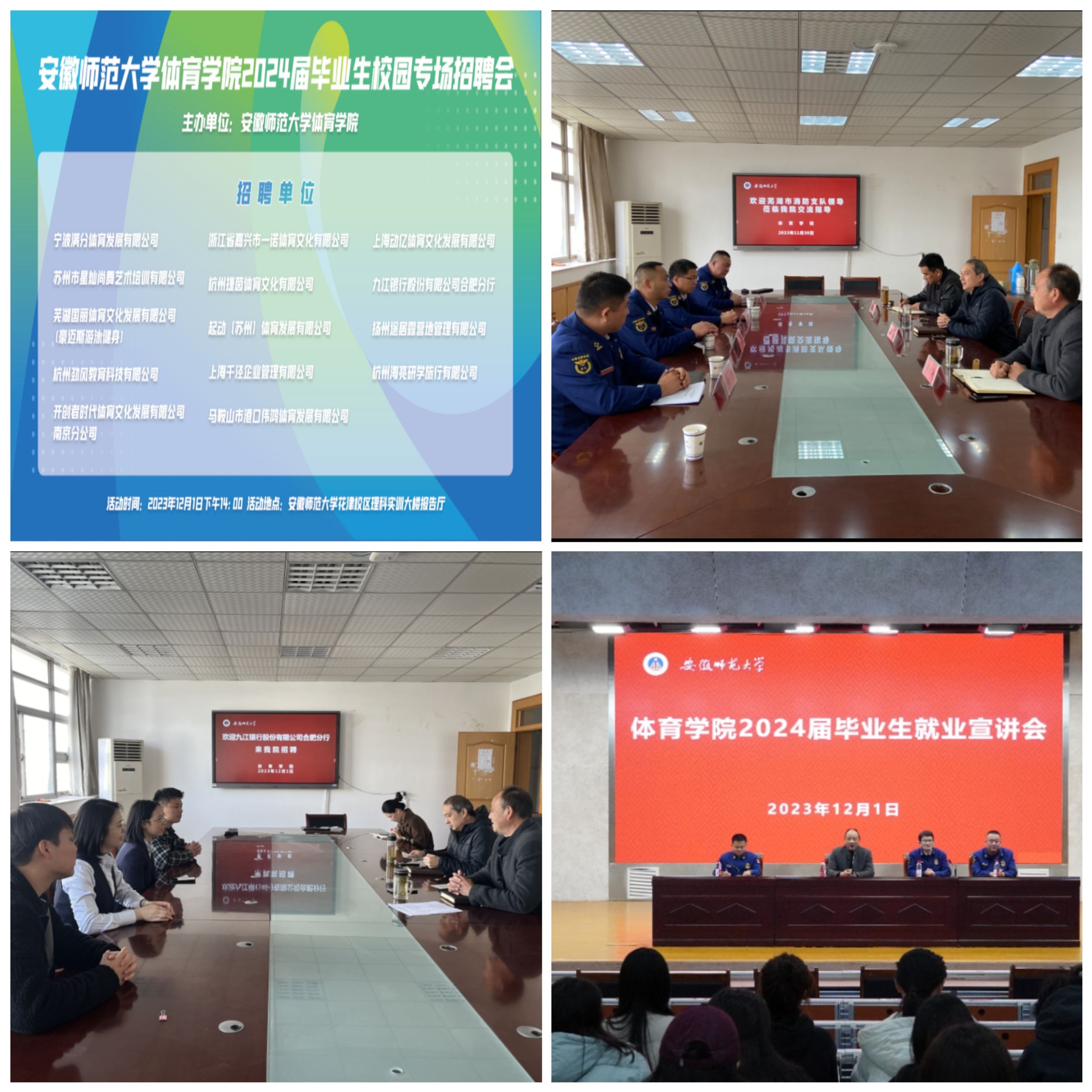 11月30日,院党委书记黄德春、院党委副书记崔世兵、篮球教师蔡维敏同应邀来访的芜湖市消防救援支队政治部主任江新兵等领导进行交流,江新兵代表支队聘请蔡维敏担任市消防救援支队篮球队总教练并提出拟在437ccm必赢国际版毕业生中招聘消防员,黄德春和崔世兵分别介绍了学院总体情况和学生就业情况并邀请他们参加学院组织的就业宣讲暨招聘会。12月1日上午,黄德春、崔世兵和毕业班辅导员同来校招聘体育专业毕业生的九江银行股份有限公司负责人进行交流,在该公司就职的437ccm必赢国际版2018届、2019届校友参加交流。