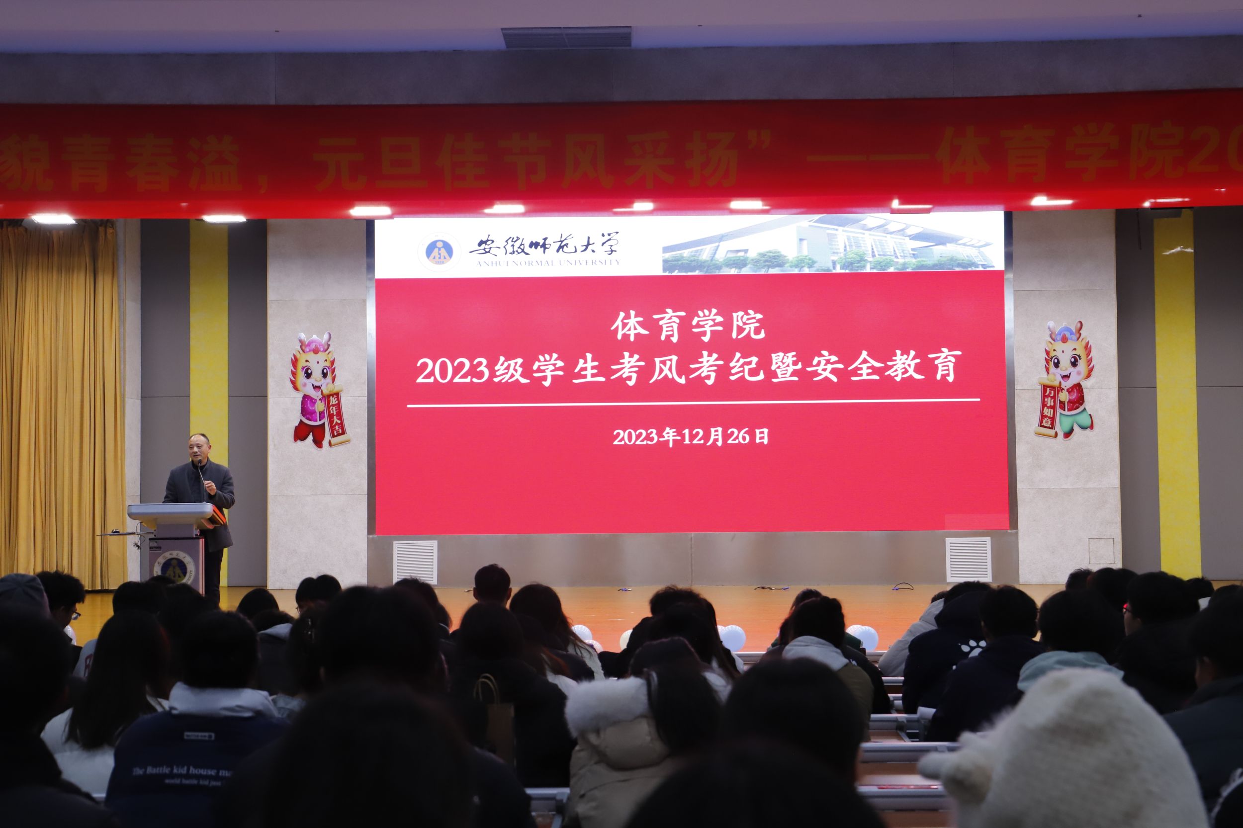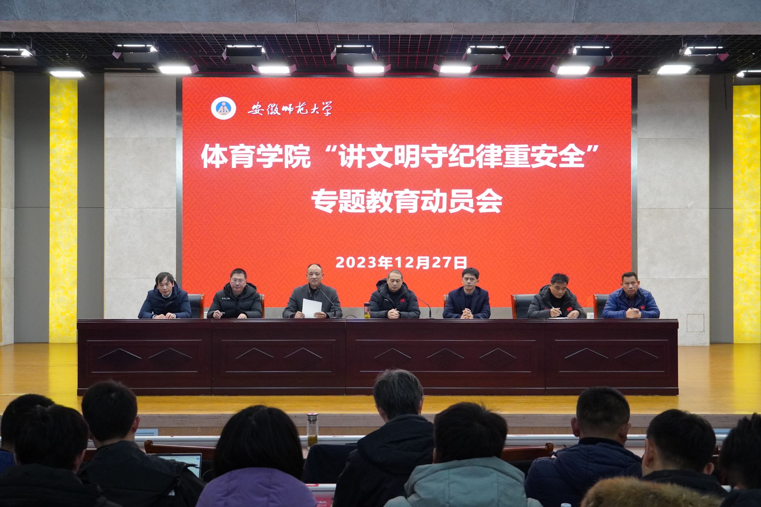 文明守纪,安全第一。12月27日下午,学院在2023年学生先进集体、先进个人表彰大会结束后,接着召开了437ccm必赢国际版“讲文明守纪律重安全”专题教育动员大会。学院领导崔世兵、岳建军、高升分别围绕必赢国际、学业护航和研究生教育等方面进行了工作部署并提相关要求,院党委书记黄德春作动员讲话,他充分肯定了一年来学院必赢国际取得的诸多工作成效,也指出了学院学生基础文明建设还存在弱项,希望并要求同学们筑牢安全底线、严守纪律规矩、争做文明青年,为推动学校“三大行动计划”全面实施作出体院学子新贡献。
