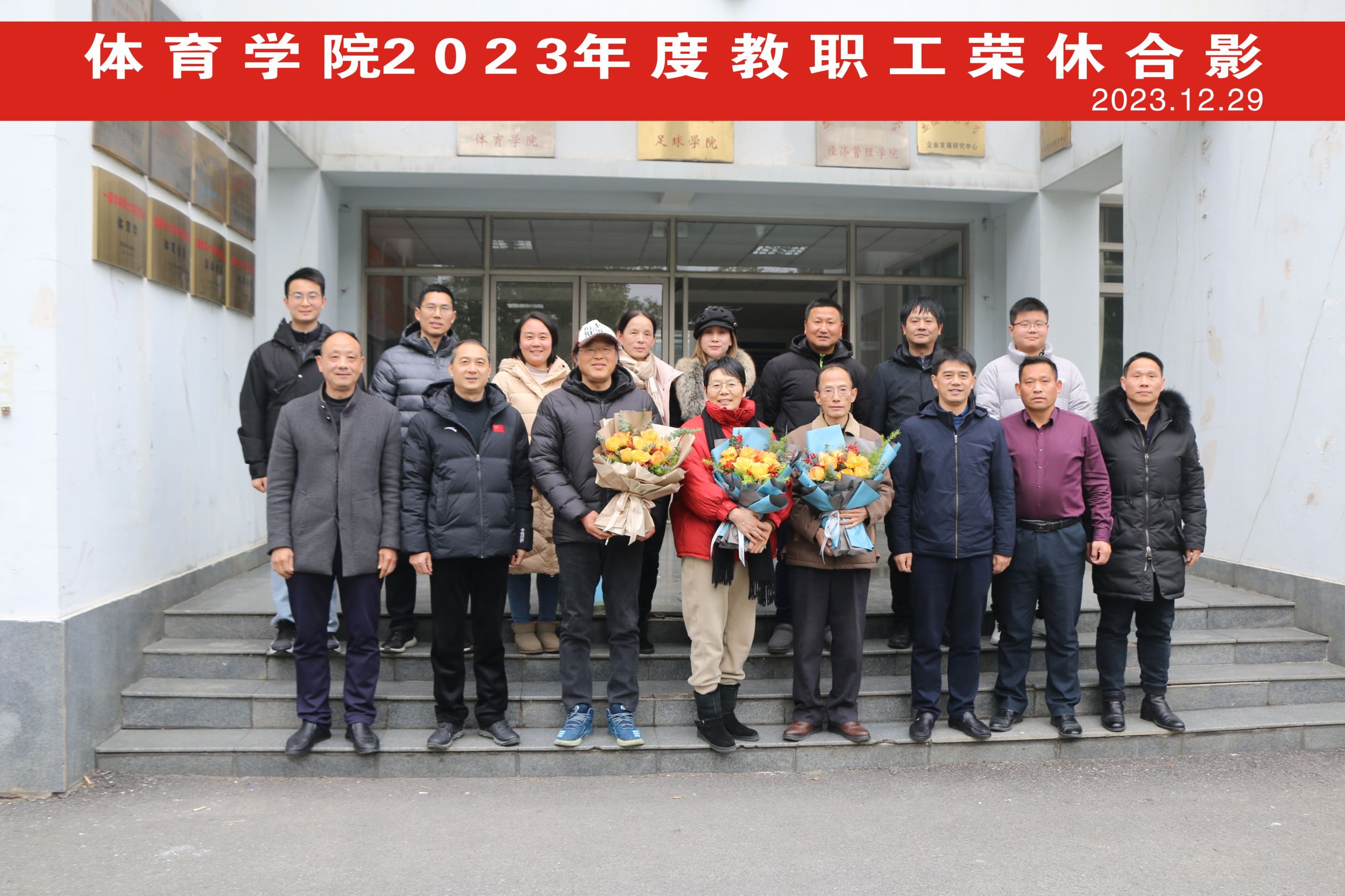 副院长高守东介绍了四位荣休教职工职业生涯所获成就。伴随着热烈的掌声,院党委书记黄德春、院长金涛代表学院向荣休教师颁发纪念品,并与他们合影留念。汪冬生、杨继星代表新进教师向荣休教师献上鲜花,为他们送上诚挚敬意和祝福。