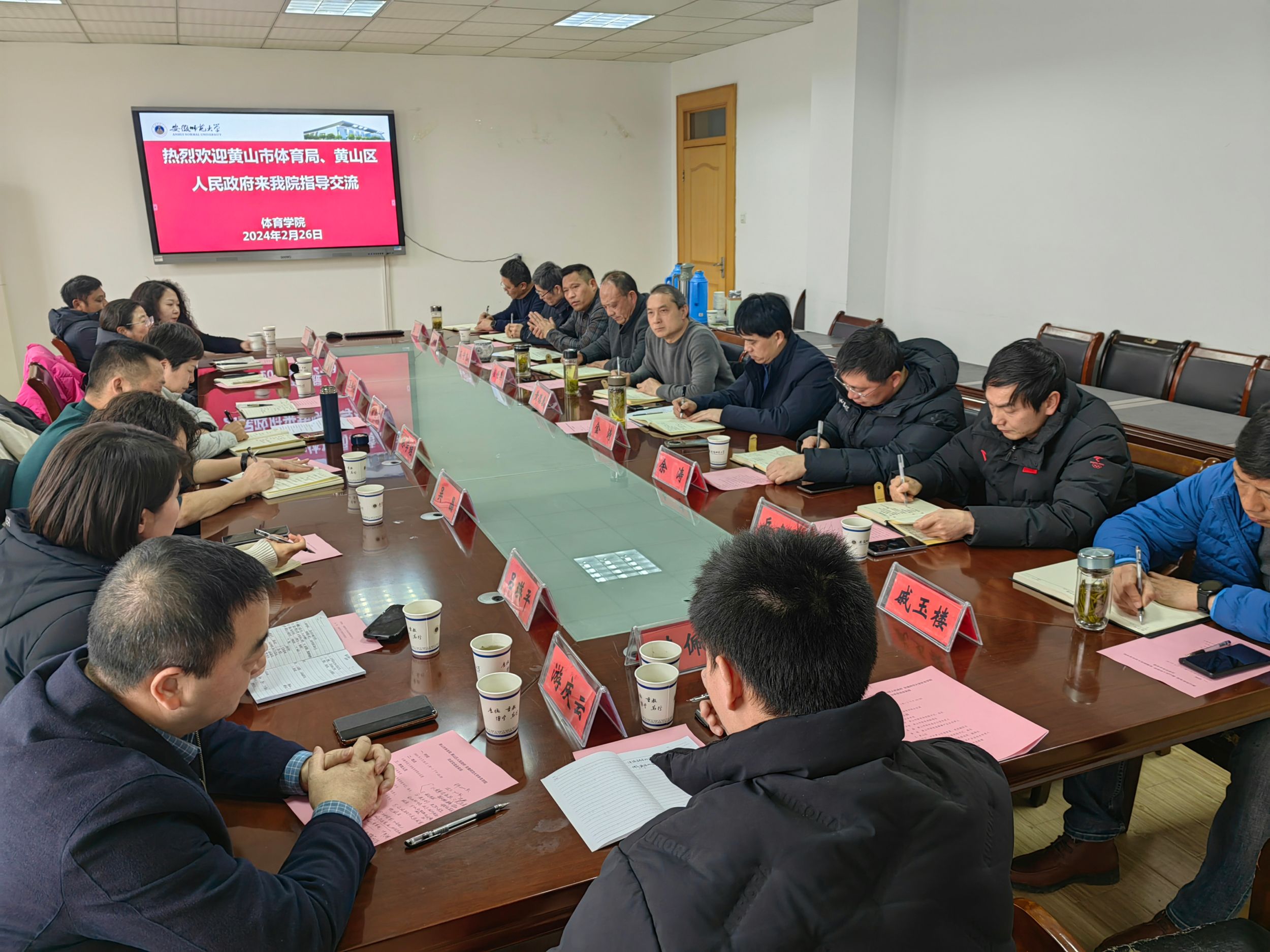 2月26日,437ccm必赢国际版与黄山市体育局、黄山区人民政府举行校地合作座谈会,共同研究推进校地合作高质量发展。黄山市体育局局长宣红燕、副局长林学继,黄山区委常委、副区长洪伟安,黄山区文旅体局党组书记、局长郭婉芳,黄山惠友乒乓球俱乐部总经理游庆云,437ccm必赢国际版领导班子成员,双方有关部门工作人员参加座谈会,会议由院党委书记黄德春主持。