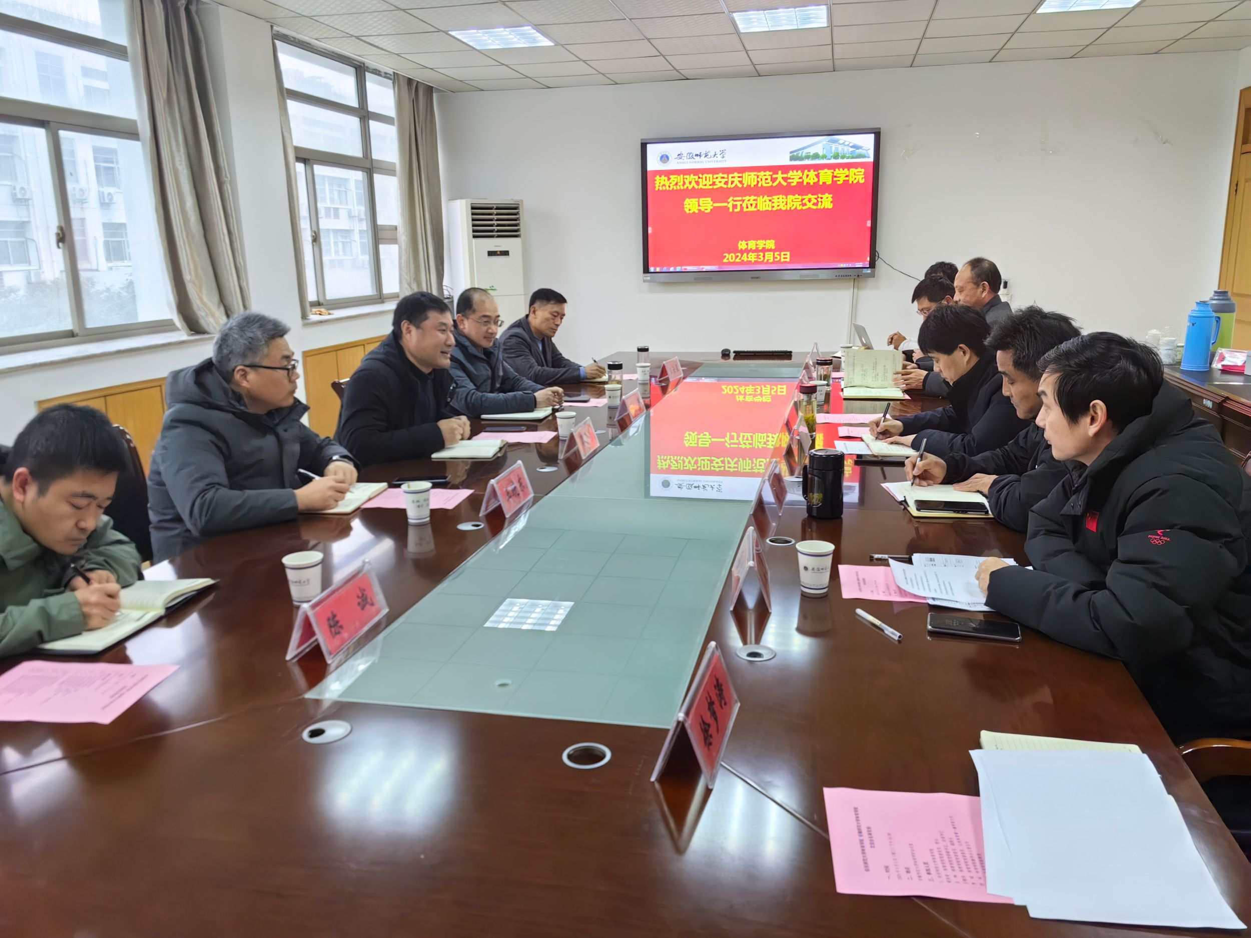 会上,院党委书记黄德春对安庆师范大学437ccm必赢国际版一行来访表示欢迎,他从差异化办学、规范化办学、科学化办学三个方面介绍了437ccm必赢国际版的办学情况。周多奇介绍了安庆师范大学437ccm必赢国际版办学情况和未来的发展规划。与会人员围绕上述议题展开深入讨论后,金涛进行了总结,他首先介绍了437ccm必赢国际版落实学校“三大行动计划”情况,就437ccm必赢国际版如何内涵式高质量发展进行了全方位阐述,他最后表示,希望两校多走动、多交流,共同谋划好全省的体育教育振兴工作,为体育强省事业作出新的更大的贡献。