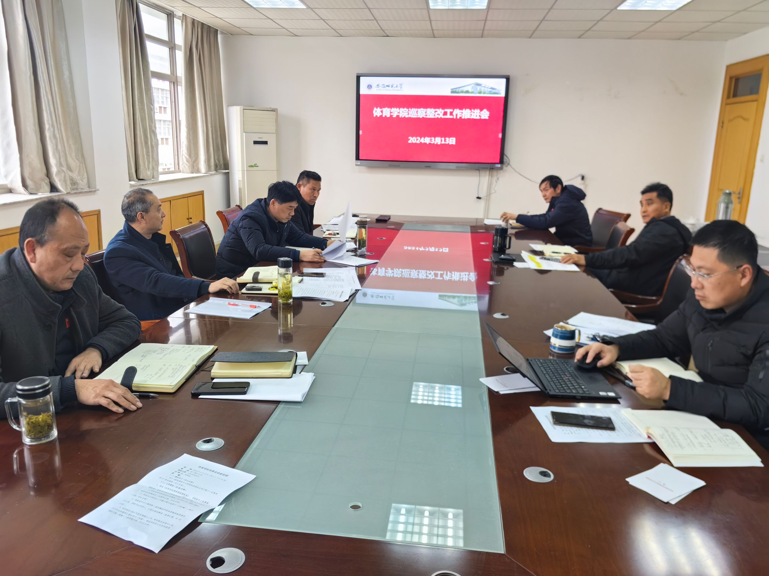 黄德春首先带领与会人员全面总结梳理计划整改措施的进展情况,对于已经完成整改的事项要求进一步巩固整改成效,对于尚未完成的整改任务要进一步细化目标任务,明确时间表、路线图、任务书,分阶段落实相关工作措施和任务。与会人员结合巡察整改任务中关于党建发展、师资队伍建设、人才培养、教学训练、学科科研、学团工作等重点工作汇报了牵头事项的整改落实情况和未完成任务下一步工作计划,明确了巡察整改后半段的学院重点工作。