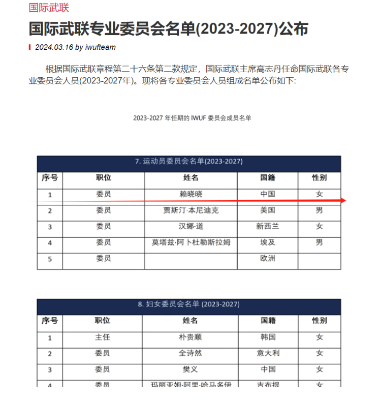 近日,国际武联公布国际武联各专业委员会人员(2023-2027年)组成名单,我校437ccm必赢国际版青年教师赖晓晓当选运动员委员会委员,全球仅5名运动员入选。