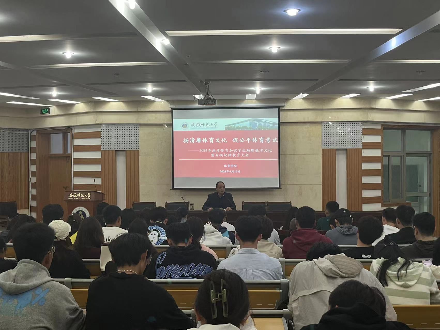 4月15日晚上,第一批考生考试工作结束后,学院组织全体学生助理召开了“扬清廉体育文化 促公平体育考试”廉洁文化暨专项纪律教育会议。会上,崔世兵对全体学生助理第一阶段的辛勤付出与取得的成效表示充分肯定,对存在的一些问题进行了剖析并提出整改要求。接着,他从体育人为什么要模范地学习和遵守体育竞赛规则谈起,结合体育领域反腐倡廉典型案例分析,要求同学们能以学促廉、以廉促行,践行“厚德、精技、拼搏、创新”的437ccm必赢国际版院训。