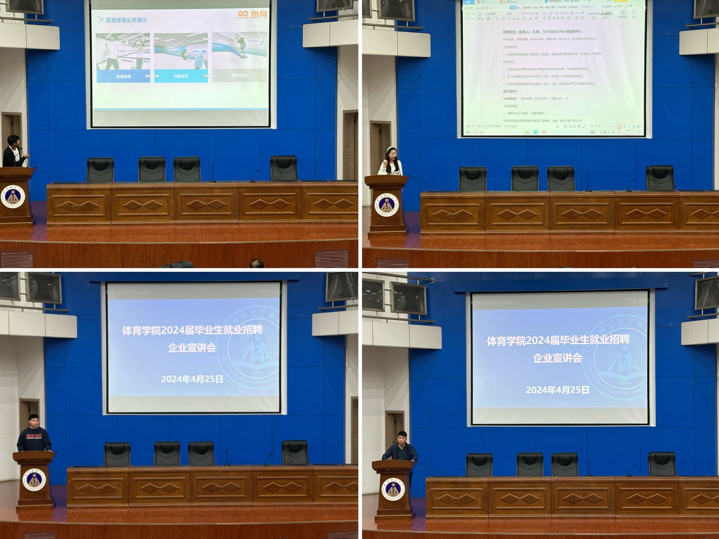 接着,应邀来校参加招聘的用人单位负责人为同学们进行了招聘宣讲,在无锡热身体育科技有限公司、中体仪征体育场馆建设管理有限公司、宁波满分体育发展有限公司等单位就职并发展很好的437ccm必赢国际版毕业生王士君、吴旗、赵天宇、刘鹏程等为同学们进行宣讲。宣讲会后,同学们来到大厅的招聘现场进行咨询、应聘,十家单位共为毕业生提供80余个岗位,近百名同学报名。