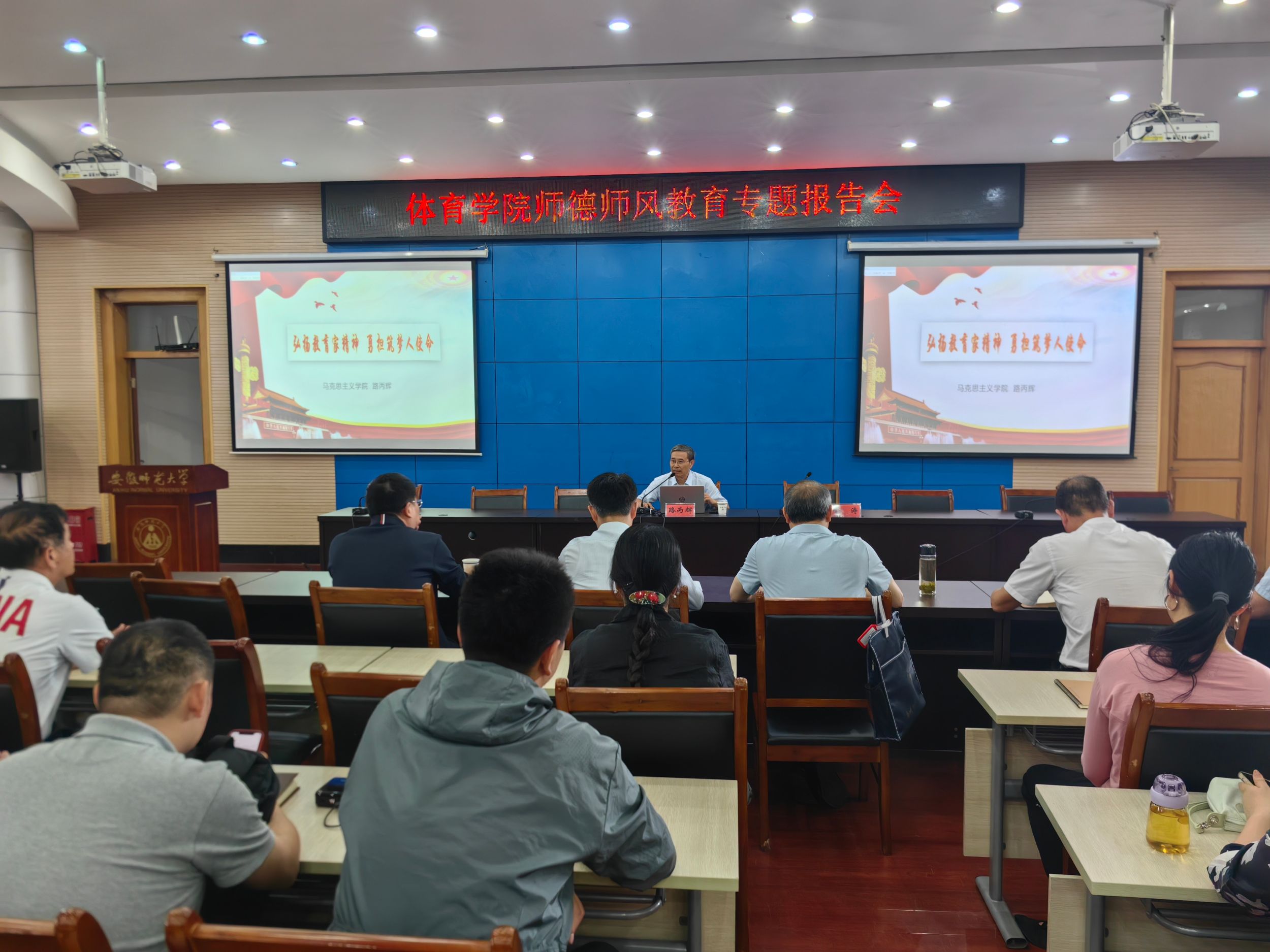 路丙辉教授以“弘扬教育家精神,勇担筑梦人使命”为主题,结合自身从教经历,重点从系统把握教育家精神的内涵要义、深刻理解弘扬教育家精神的价值、践行教育家精神以回应时代之问等三个方面做了宣讲报告。他认为广大教育工作者应当大力弘扬教育家精神,牢记为党育人、为国育才使命,不断提高自身道德修养,以模范行为影响和带动学生,坚守教育初心、勇担育人使命,切实做到心有大我、言为士则、启智润心、勤学笃行、乐教爱生、胸怀天下,为教育强国建设、实现中华民族复兴伟业做出更大贡献。在场老师聚精会神,认真聆听了路丙辉教授的精彩报告。
