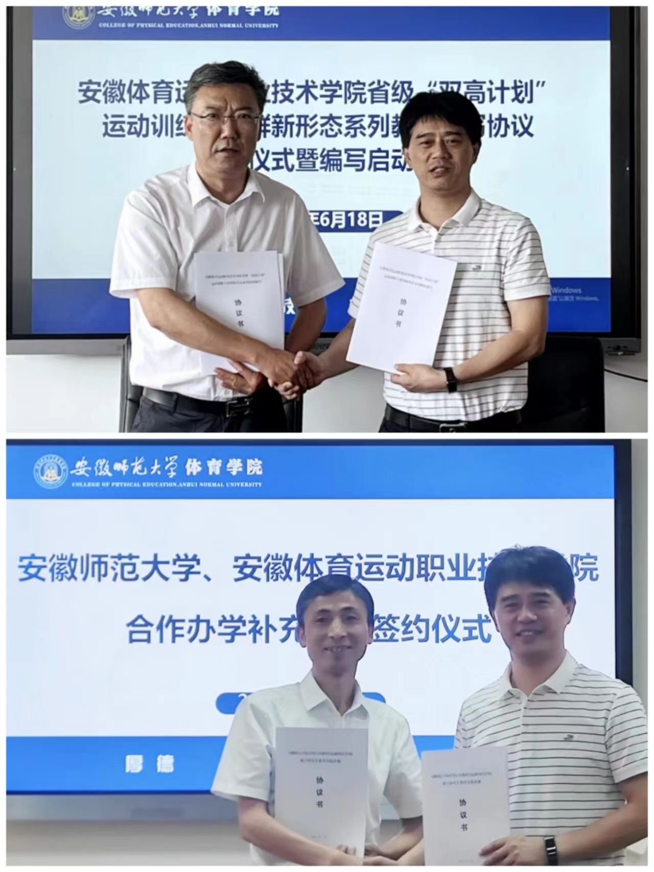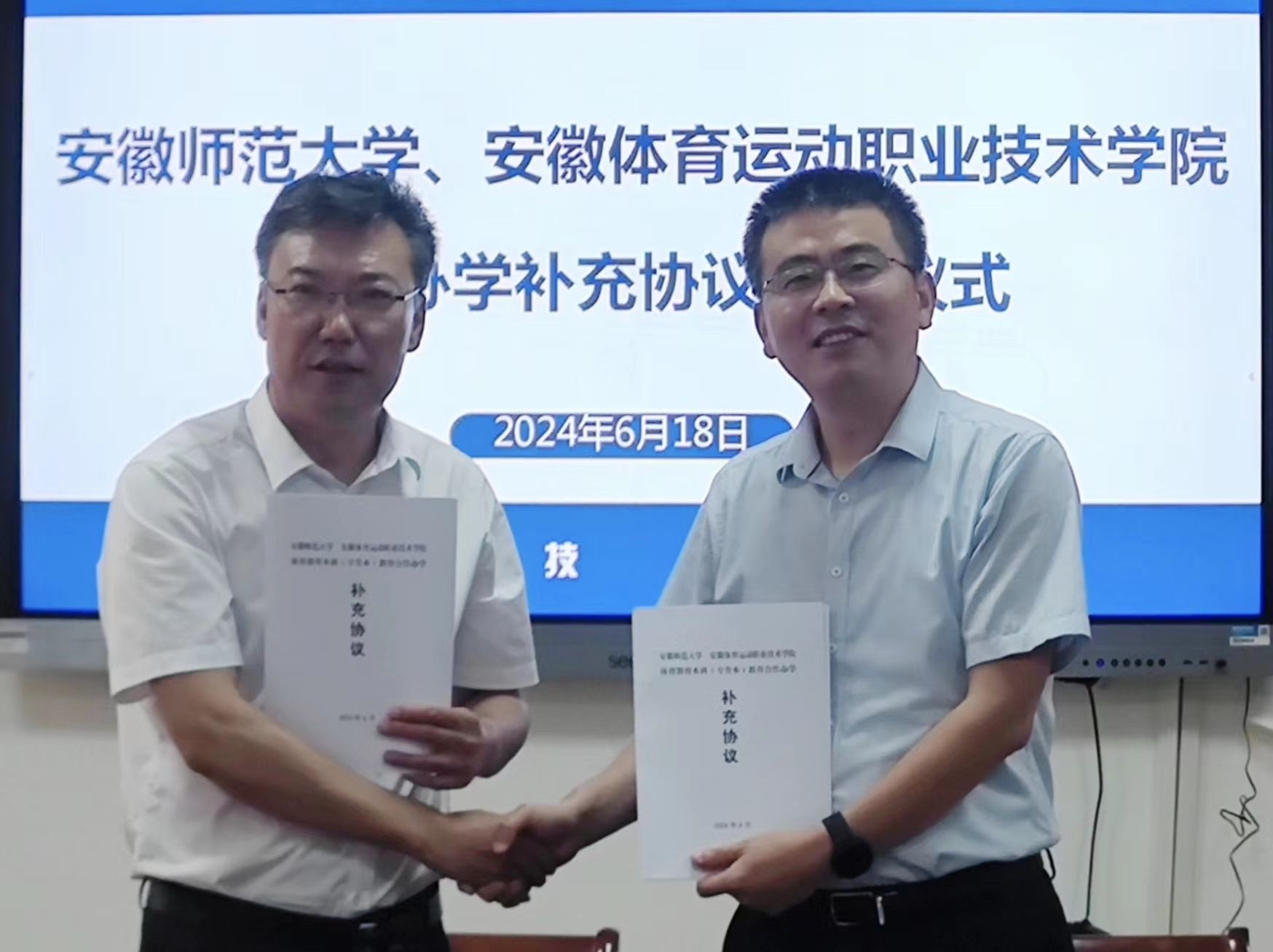 任永与刘文波代表双方签署两校体育教育本科(专升本)教育合作办学补充协议。437ccm必赢国际版院长金涛分别与刘文波、李致富签署两校省级“双高计划”系列教材编写协议、两校研究生教育实践基地协议。