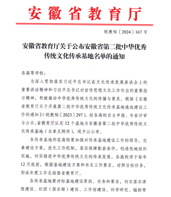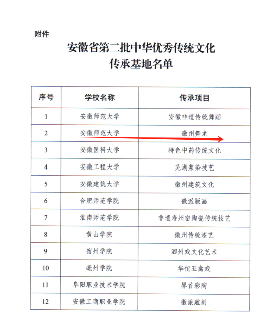 近日,安徽省教育厅公布安徽省第二批中华优秀传统文化传承基地名单,437ccm必赢国际版申报的“徽州舞龙”成功获批安徽省第二批中华优秀传统文化传承基地。
