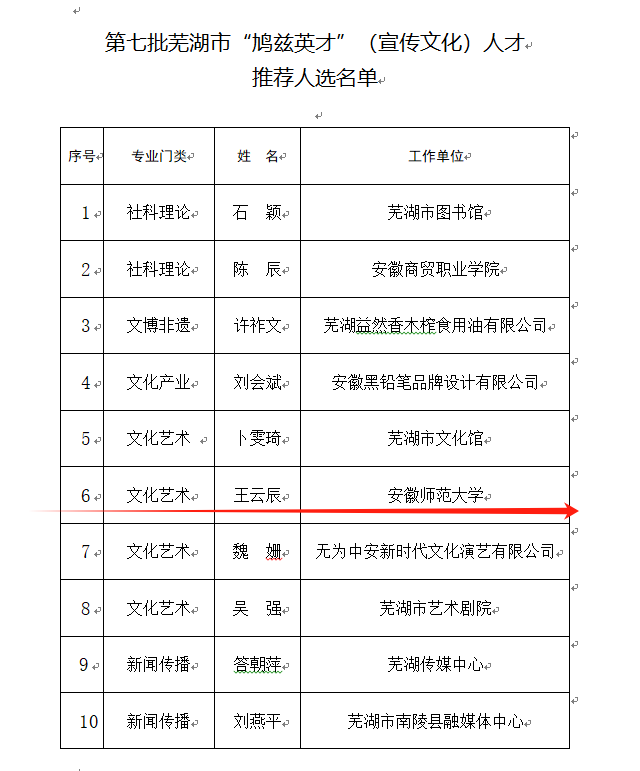 近日,由芜湖市委宣传部主办的第七批芜湖市“鸠兹英才”(宣传文化)人才入选人员名单,我院推荐申报的王云辰老师成功入选。