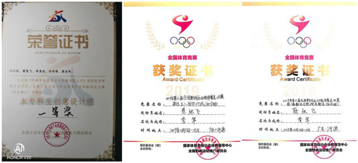 2019年:全国大学生体育产业创新创业大赛(华东赛区)一等奖。