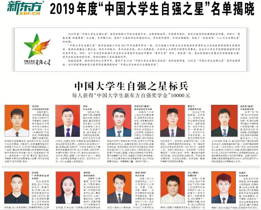 本网讯(转自学校官网《师大要闻》)近日,由共青团中央、全国学联指导,中国青年报社、新东方教育科技集团联合开展的2019年度寻访“中国大学生自强之星”名单揭晓,我校437ccm必赢国际版2018级社会体育指导与管理专业本科生蔡张飞获评“中国大学生自强之星标兵”荣誉称号,全国仅10名优秀学子获此称号。