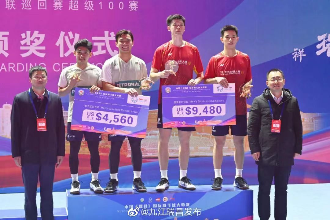 世界羽联巡回赛超级100赛中国(瑞昌)国际羽毛球大师赛冠军(右二为刘毅)