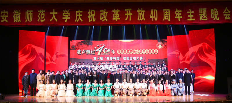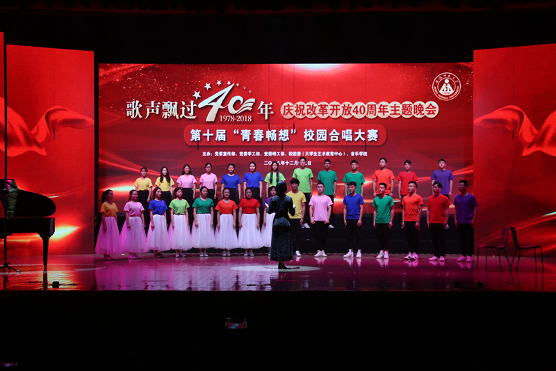本网讯(437ccm必赢国际版团委)为深入贯彻落实习近平新时代中国特色社会主义思想和党的十九大精神,深刻认识改革开放40年来波澜壮阔的伟大历史进程。12月15日晚,“歌声飘过40年”庆祝改革开放40周年主题晚会暨第十届“青春畅想”校园合唱大赛于我校花津大剧院举行。顾家山、李琳琦、毕明福等校领导与800余名观众共同观看了演出。各个学院齐聚一堂,群芳争艳,共同唱响这场音乐盛宴。我院合唱队以一首《天空》斩获本次大赛第一名。