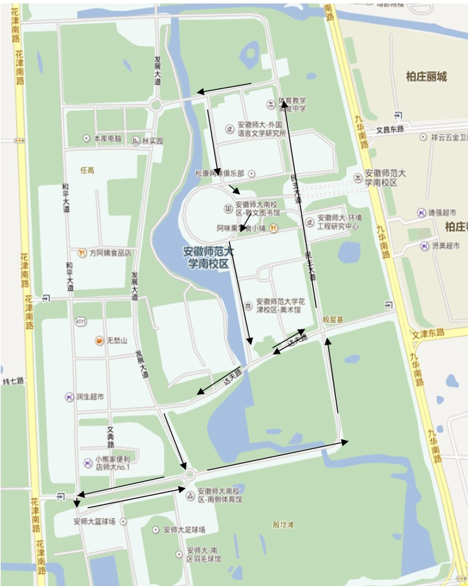 因我校三个校区道路、体育场地及车辆密集情况不同,考虑安全因素,“阳光体育”锻炼须在如下道路与场地进行,花津校区学生必须在规定的有效区域内,按照软件提供的按点跑(五个点)的随机路线,然后再自己自由选择路线,直至跑完规定距离路程后结束锻炼,赭山校区与天门山校区学生必须在规定的有效区域内,按照环跑路线锻炼,成绩才认定有效。