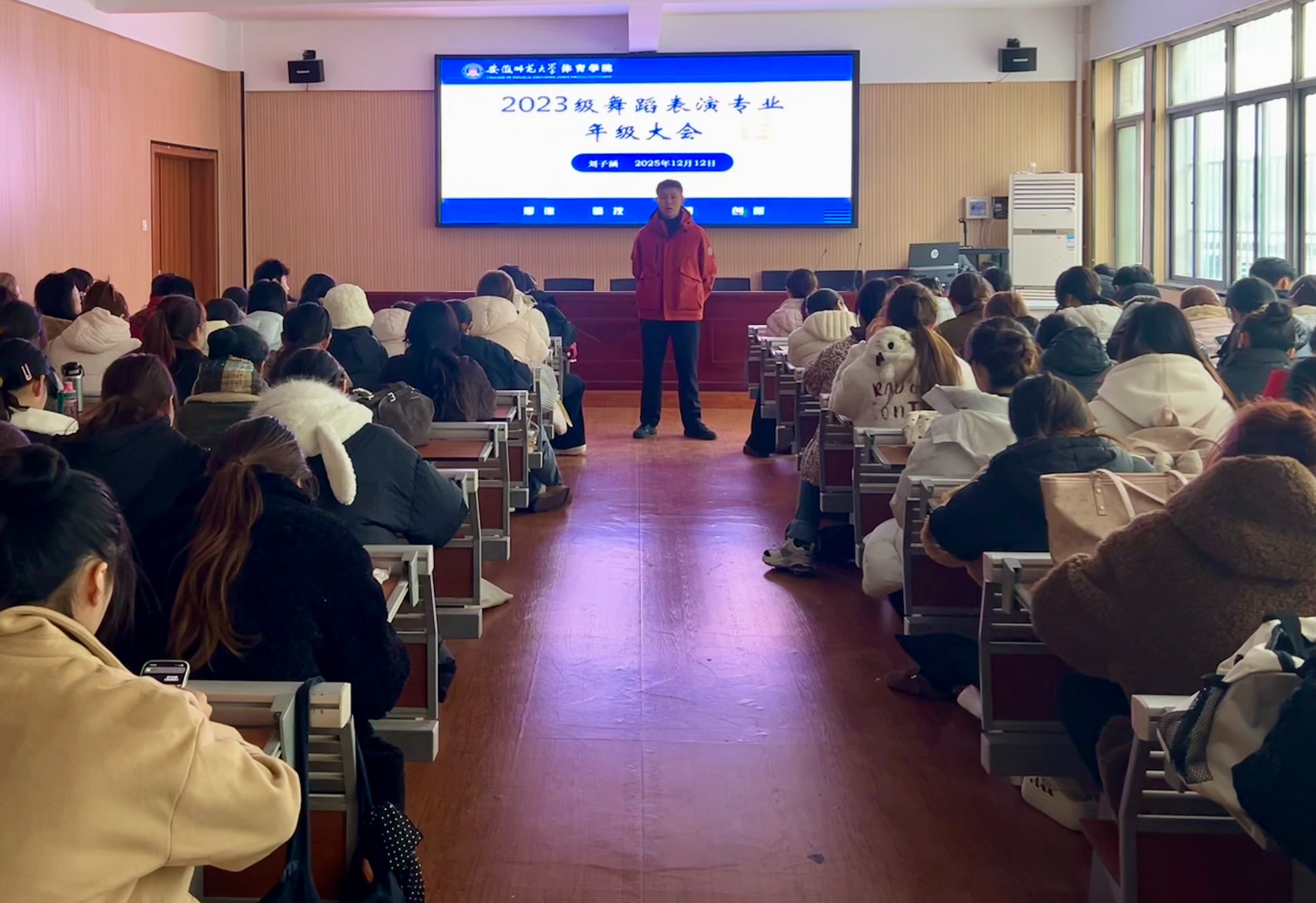 2025年12月12日,437ccm必赢国际版2023级舞蹈表演专业在北田径场多媒体教室以“切实提升师生法治素养,筑牢校园法治安全防线”为主题召开年级大会,会议由辅导员刘子涵主持,年级全体学生参与。