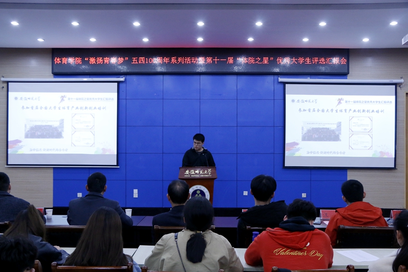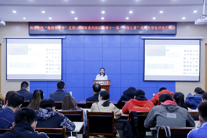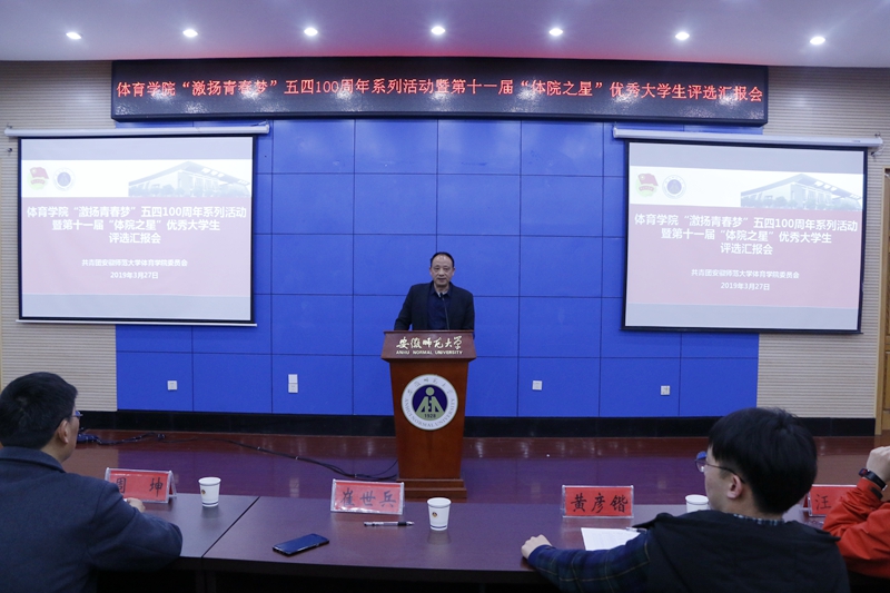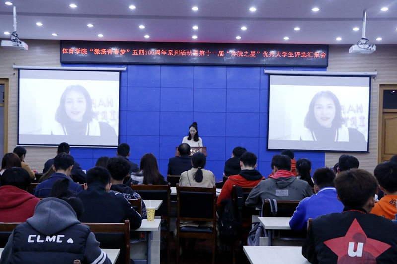 本网讯(437ccm必赢国际版 蔡佳佳 李堃)为引领体院学子在青春实践中成长成才,全面展示青年学生奋发向上的精神风貌,培育大学生先进典型。437ccm必赢国际版于3月27日晚在花津校区会议中心第二会议室隆重举行了“激扬青春梦”纪念五四100周年系列活动暨第十一届“体院之星”优秀大学生评选汇报会。院党委副书记崔世兵,社会体育指导与管理专业负责人周坤教授,437ccm必赢国际版团委书记黄彦锴,团委副书记张学谦、张程祥、朱平林,全体辅导员老师及各年级各专业学生代表200余人出席汇报会。