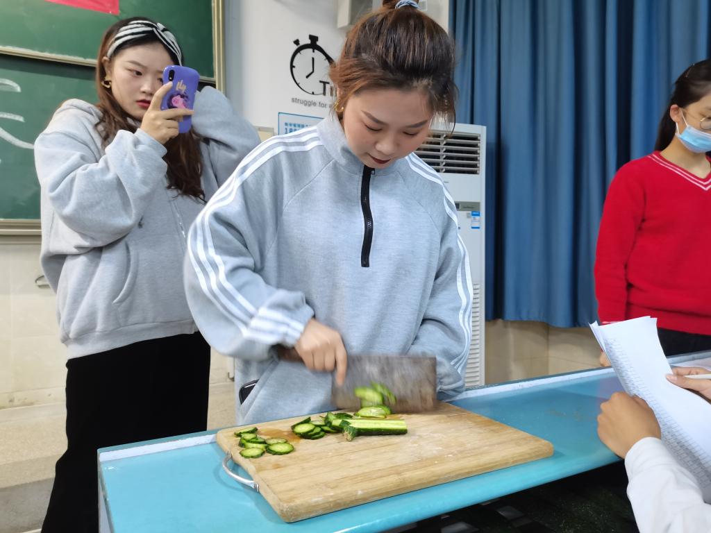 比赛以班级小组为单位,各小组上报菜名后,先进行切菜刀工技法展示,然后阐述菜品选材、配料、做法、营养和寓意。