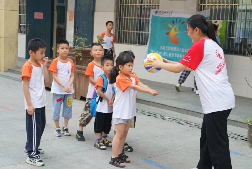 “同学们,我们开始熟悉步伐。排球中的步伐有五个,分别是:并步、滑步、交叉步、跨步、跑步,现在开始练习。”志愿者赵洋一边示范一边对同学们说。步伐的整体练习强度较大,汗水逐渐浸透了学生们的衣衫,但他们并没有喊累,也从未要求过休息。为民的夏天,阳光从密密层层的枝叶间透射下,伴着孩子们的努力与嬉笑,谱写出了一段舒畅惬意的支教生活。