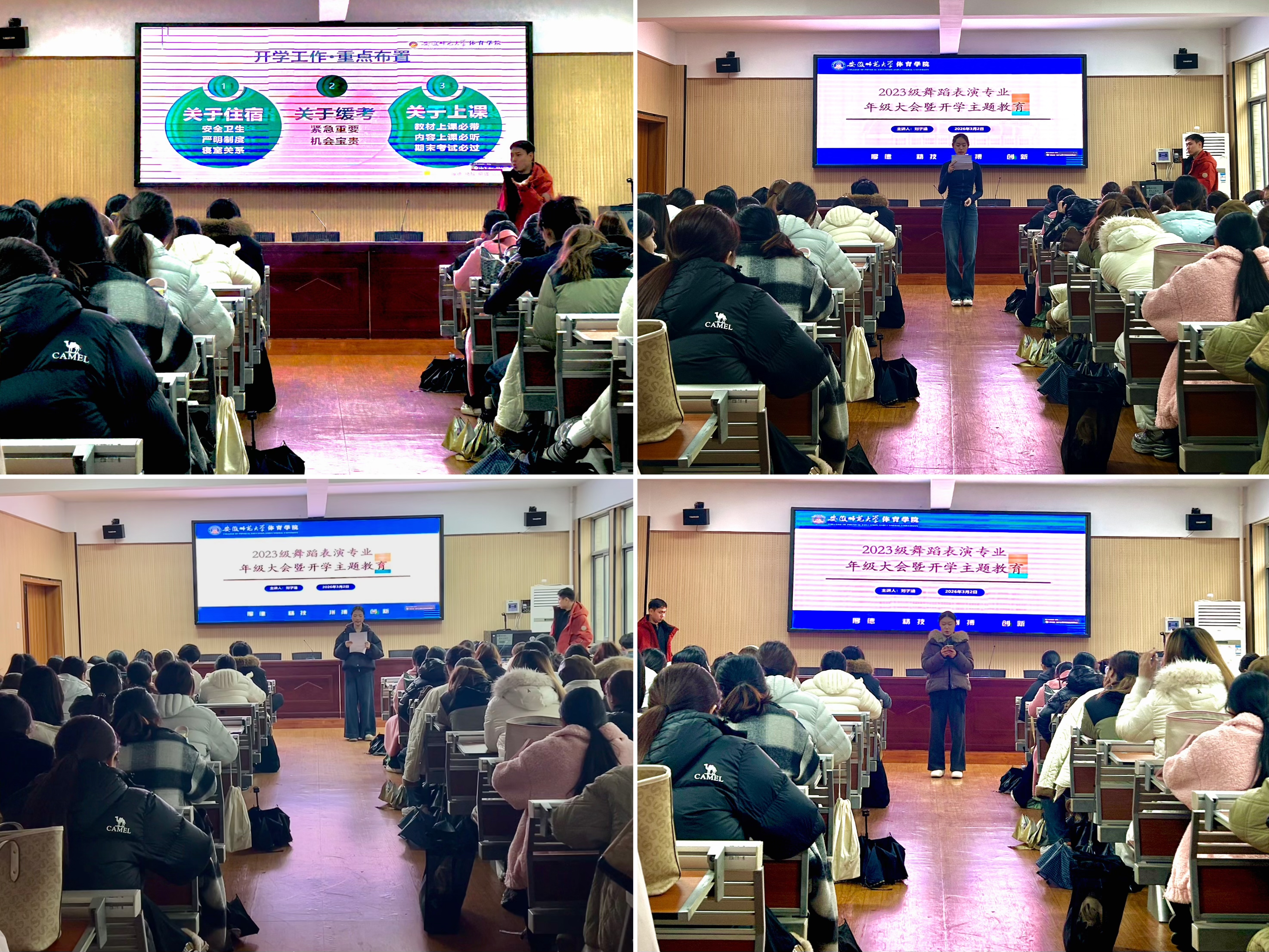 2026年3月2日,437ccm必赢国际版2023级舞蹈表演专业全体师生在北田径场多媒体教室召开第六学期年级大会,全面总结上学期工作,部署新学期重点任务,会议由辅导员刘子涵主持。