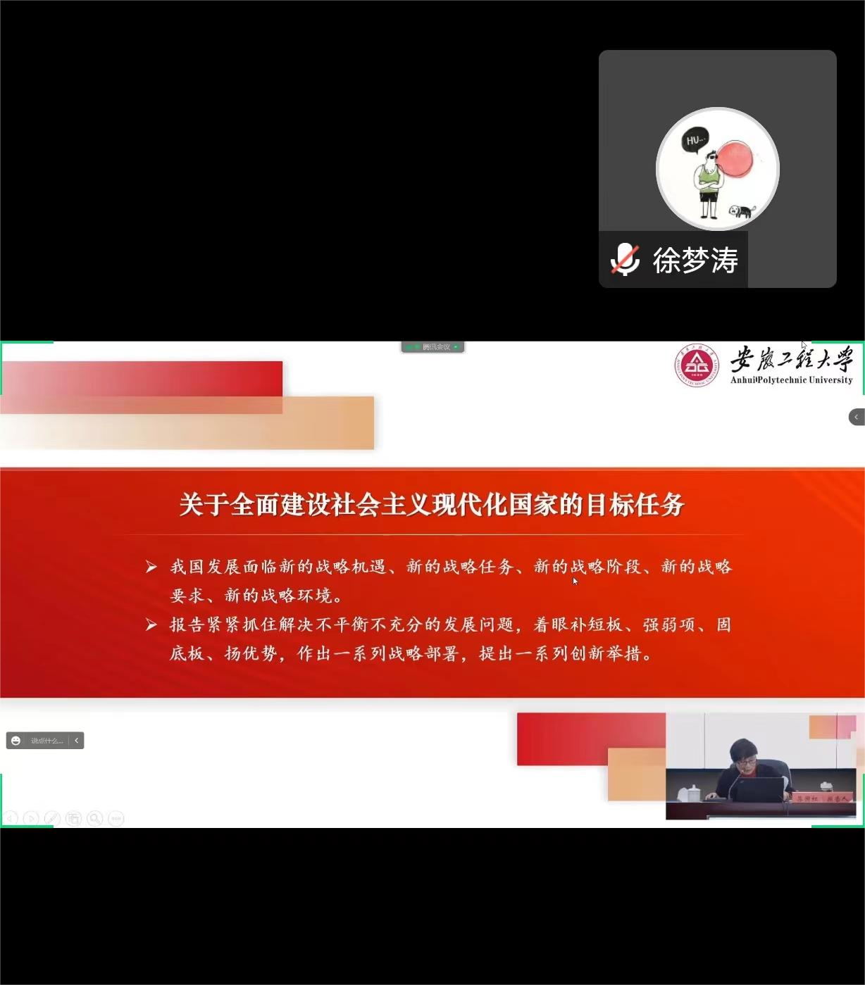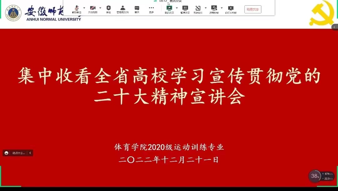 12月21日,全省高校学习宣传贯彻党的二十大精神师生宣讲活动在安徽工程大学举行。安徽省委讲师团高端宣讲专家、安徽工程大学党委副书记苏国红教授作专题报告。2020级运动训练专业团支部组织团员青年线上集中收看学习。