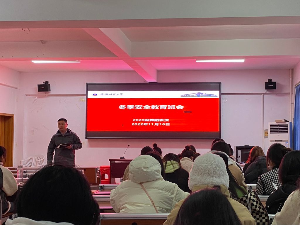 为进一步加强大学生安全教育,不断强化大学生冬季安全责任意识,11月16日,2020级舞蹈表演专业召开冬季安全教育主题班会,辅导员徐梦涛以案例分析形式引导同学们筑牢冬季安全思想防线,切实提高同学们“安全第一、预防为主”的安全责任意识、自律意识和安全防范能力。班级还将结合学校安全检查,开展宿舍学生安全自查、小组互查、辅导员抽查工作,多措并举坚守安全底线,多管