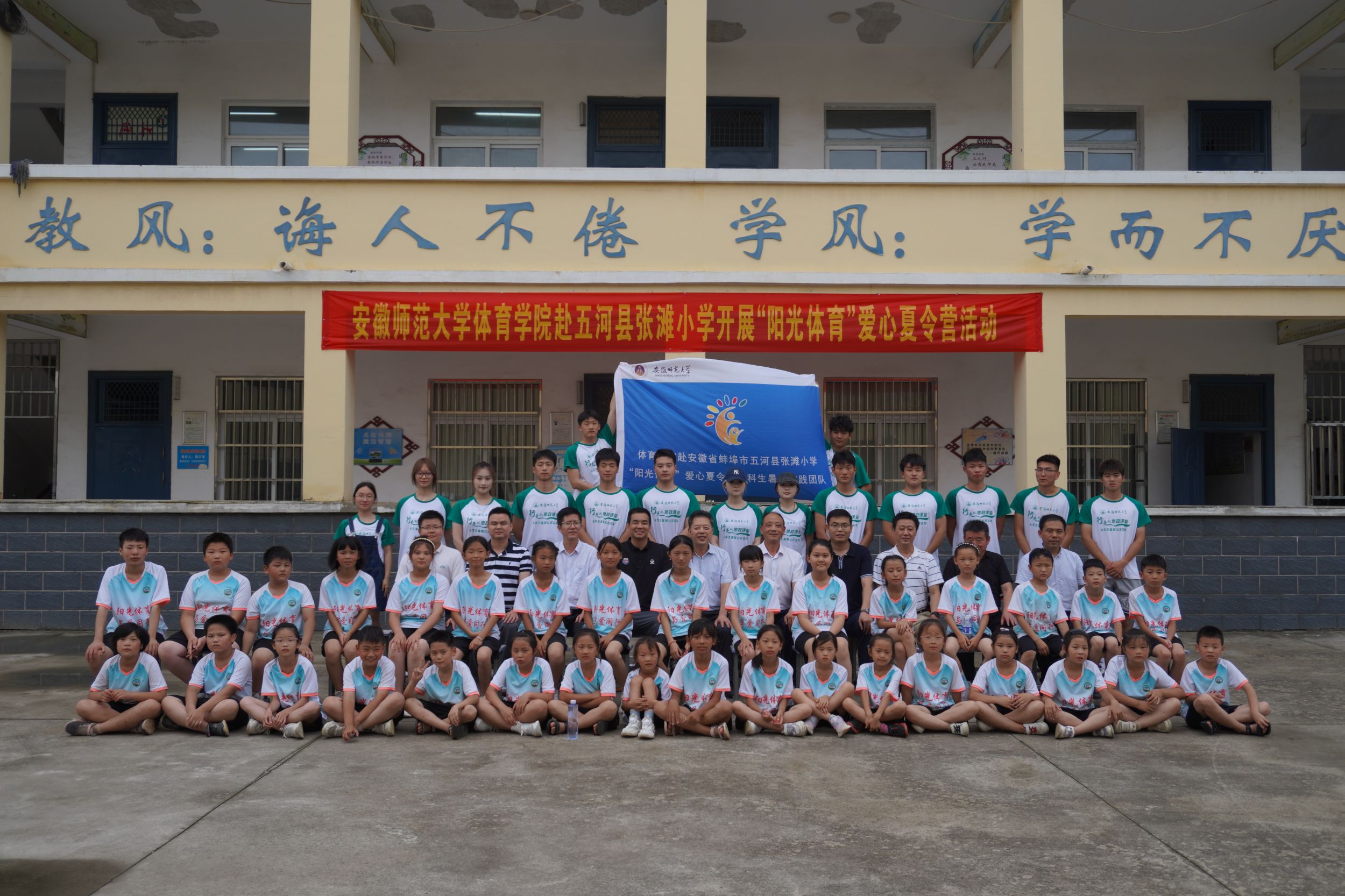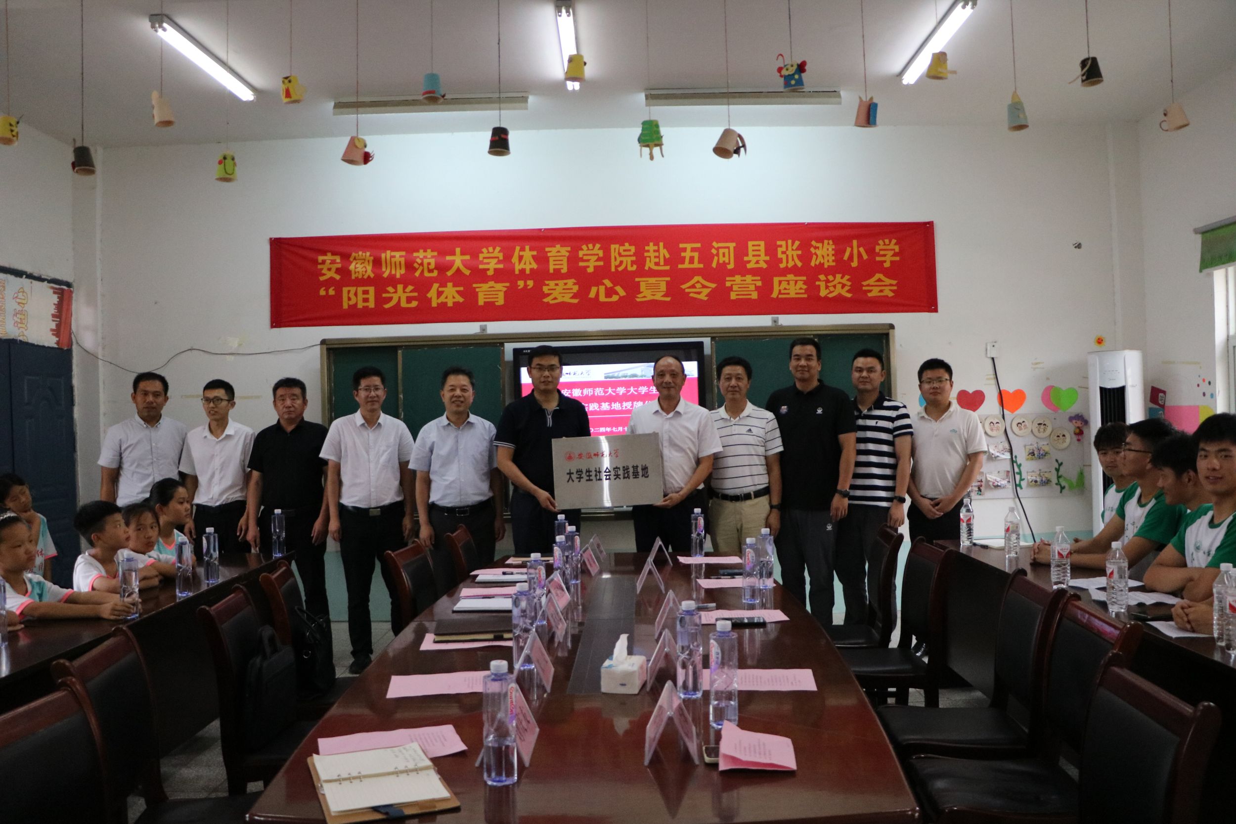 本网讯(钟爱一生 冯楚涵)7月18日下午,437ccm必赢国际版赴蚌埠市五河县张滩小学“阳光体育”爱心夏令营座谈会暨大学生社会实践基地授牌仪式在张滩小学举行。院党委副书记崔世兵、院办公室主任陈实、团队指导教师蔡维敏、辅导员张学谦、汪冬生,五河县政府副县长苏永松、五河县教育局局长顾为国、副局长朱亮、局办公室主任刘儒波、双忠庙中心小学党总支书记刘庆友、张滩小学校长刘伟以及夏令营师生代表等参加上述活动。