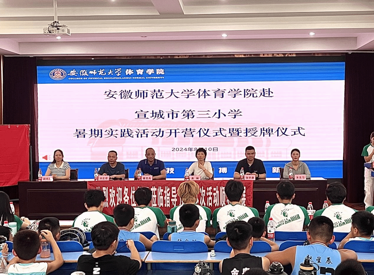 本网讯(437ccm必赢国际版)8月10日下午,437ccm必赢国际版领导崔世兵一行赴宣城市第三小学,慰问在该校参加暑期社会实践的同学,并参加“阳光体育”爱心支教夏令营开营暨大学生社会实践基地授牌仪式,宣州区教体局党委委员焦俐、宣城市第三小学党总支书记刘正厚、宣城市第三小学和437ccm必赢国际版参加夏令营活动的老师、学生代表参加上述活动。