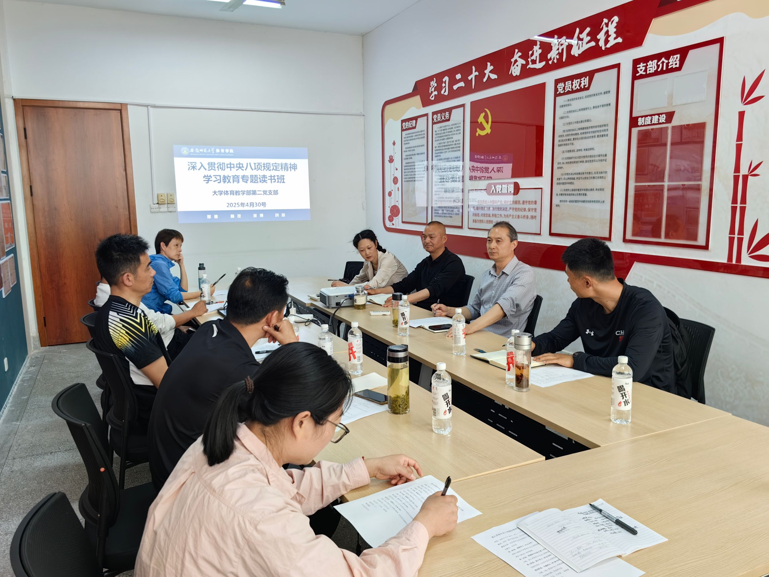 2025年4月30日下午,大学体育教学部第二党支部在学校南体育馆二楼“民族体育传承与保护邹华刚工作室”开展深入贯彻中央八项规定精神学习教育读书班暨专题党课,437ccm必赢国际版党委书记黄德春及支部全体党员参加会议,会议由支部书记邹华刚主持。