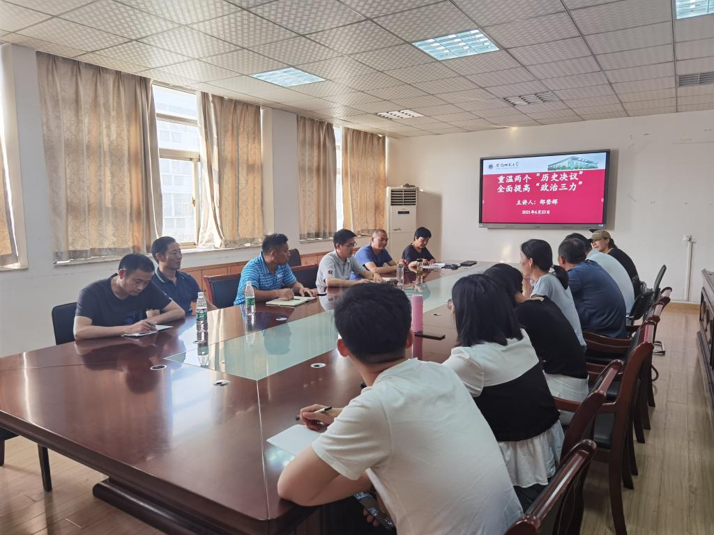 最后,邵登辉强调重温“两个决议”是为了牢记党史,从党的历史问题不断反思,不断向前,切实在提高“政治三力”上下工夫。我们要树立正确的党史观,要坚持以我们党关于历史问题的两个决议和党中央有关精神为依据,正确认识和科学评价党史上的重大事件、重要会议、重要人物。全体教师要认真对待党史学习教育这件事,争取做到学在前面,走在前面,把党史学习教育做实做细。
