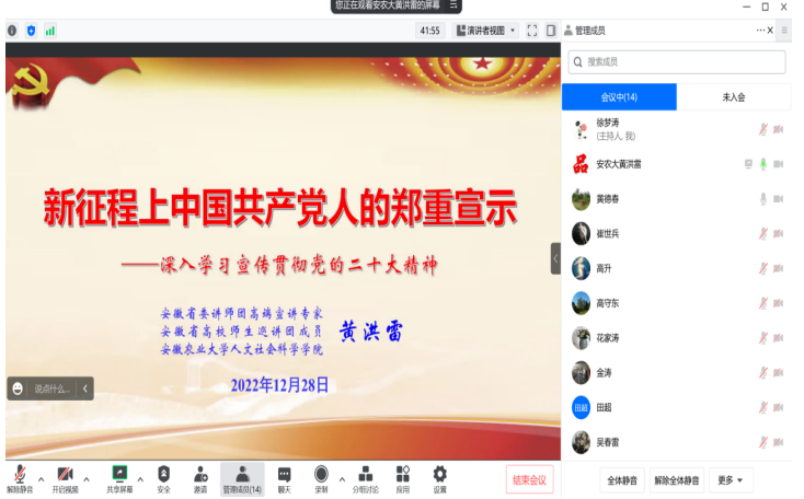 专题研讨会采取专题辅导、交流研讨相结合的形式。在专家辅导环节,省委讲师团高端宣讲专家、全省高校党的二十大精神师生巡讲团成员、安徽农业大学人文科学学院院长黄洪雷教授从三个方面就学习贯彻党的二十大精神作了专题辅导,带领大家全面准确学习领会党的二十大精神,深入理解内涵,精准把握外延。