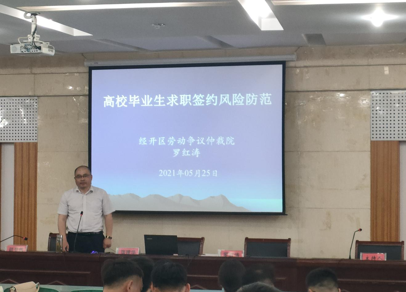 会议邀请了经管学院副教授张建华老师;原芜湖市经济开发区人力资源开发中心副主任、现芜湖市劳动人事争议仲裁院罗红涛副院长参加会议。我院邵登辉书记和毕业班辅导员蒋先军老师出席了本次活动。